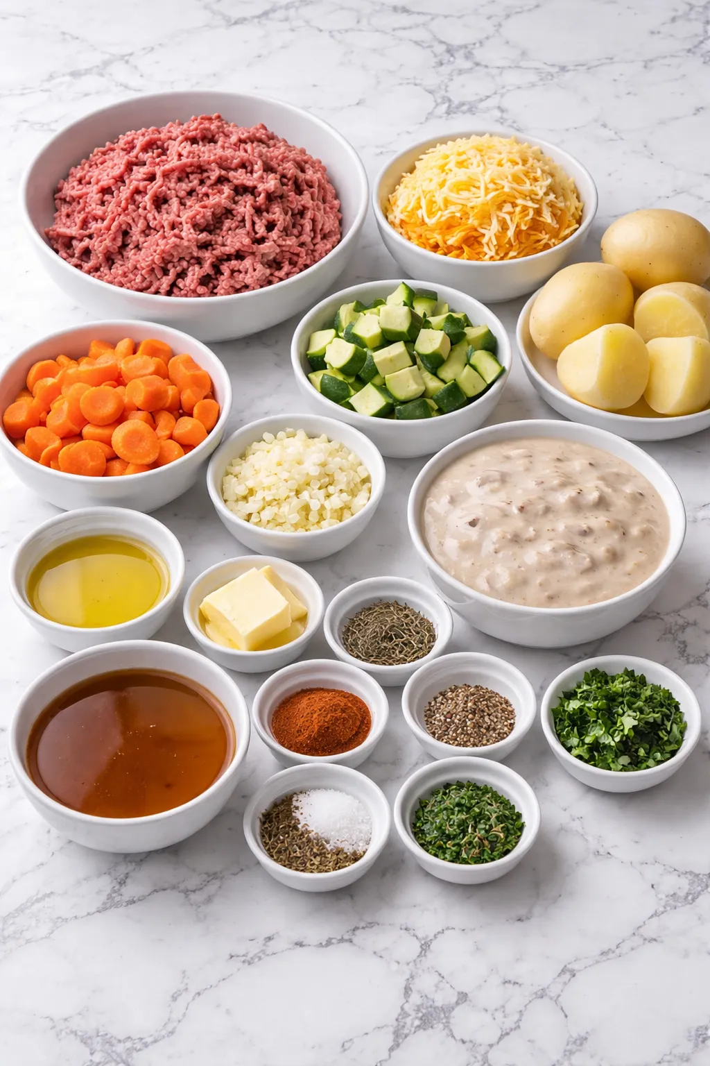 - Ground beef – forms the hearty, savory foundation of the casserole.