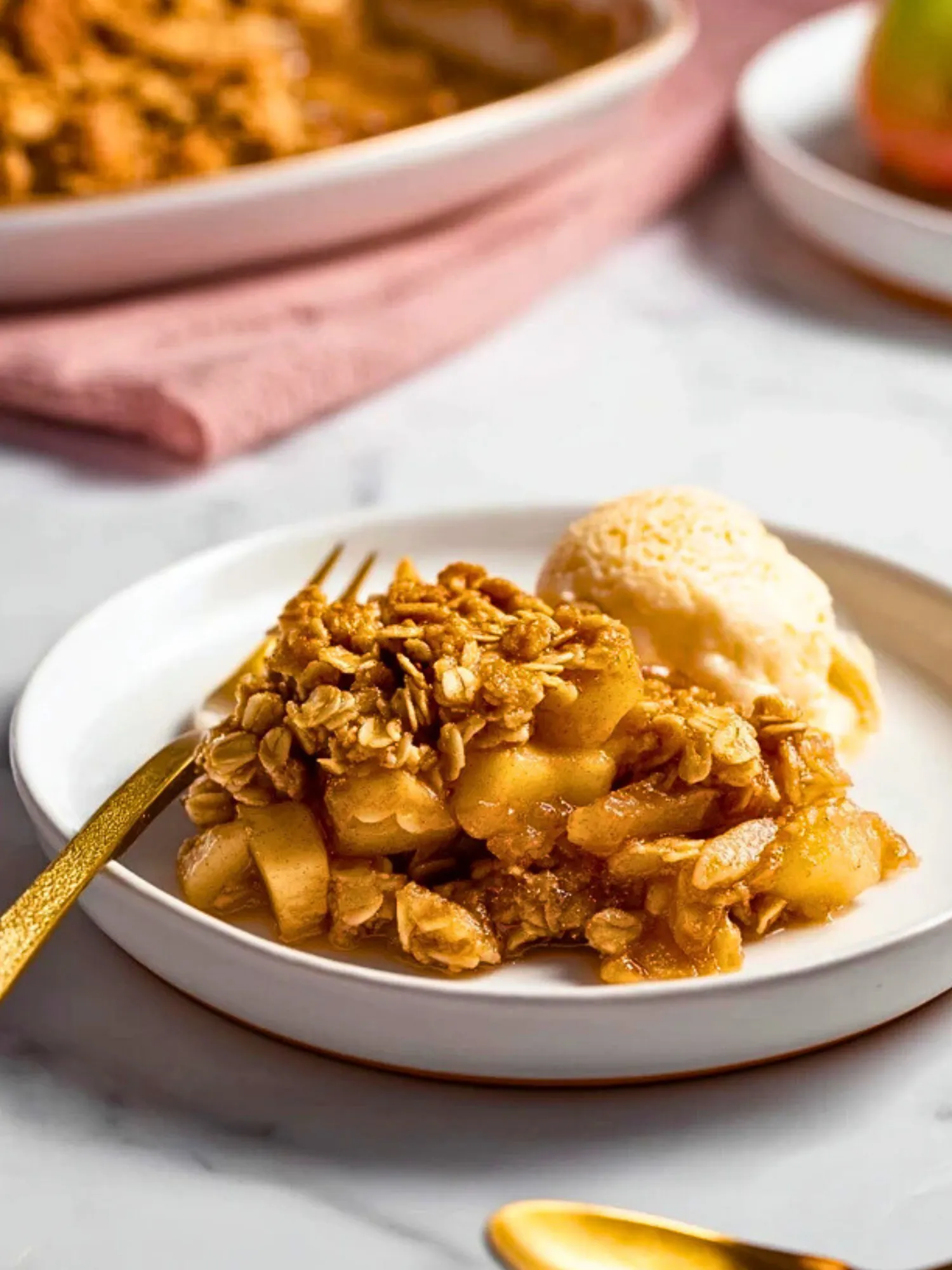 Topped with a scoop of vanilla ice cream and a drizzle of caramel, this classic dessert becomes an unforgettable treat. It’s rustic, homey, and doesn’t require a pie crust—making it so much easier and just as satisfying.