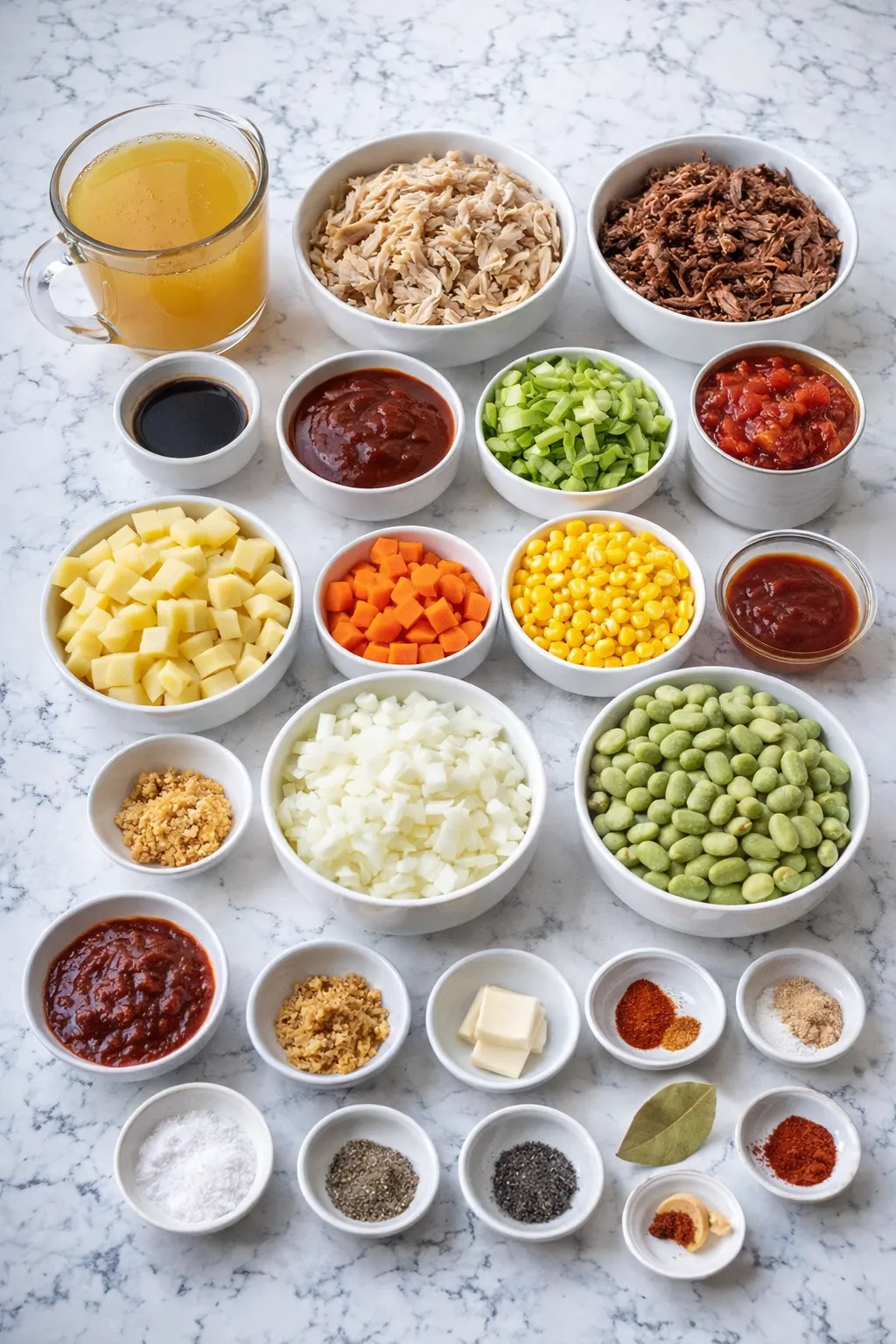 For the richest flavor, a combination of shredded cooked chicken (rotisserie works beautifully) and pulled pork is ideal. The chicken keeps things leaner and tender, while the pork adds smoky depth and that unmistakable barbecue note. If you’ve got leftover smoked brisket, turkey, or even ham, you can absolutely stir those in too. The key is using fully cooked meats that can simmer gently without drying out.