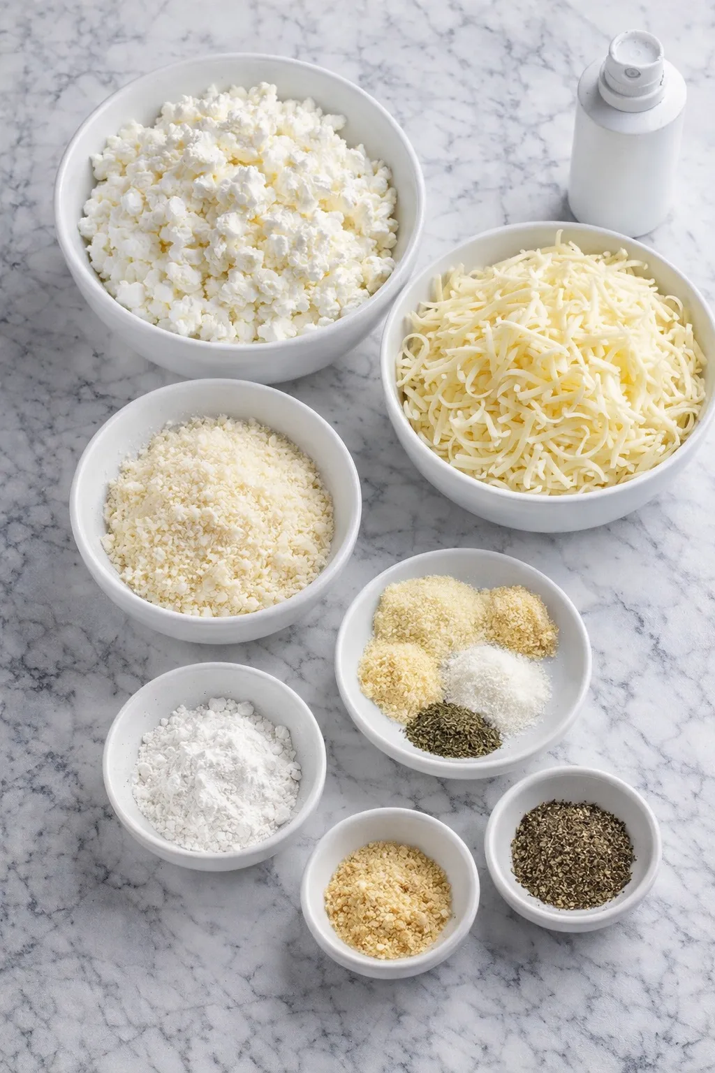 • Shredded mozzarella or mild white cheese – Melts smoothly and helps bind the cottage cheese into cohesive rounds with a stretchy, cheesy texture.