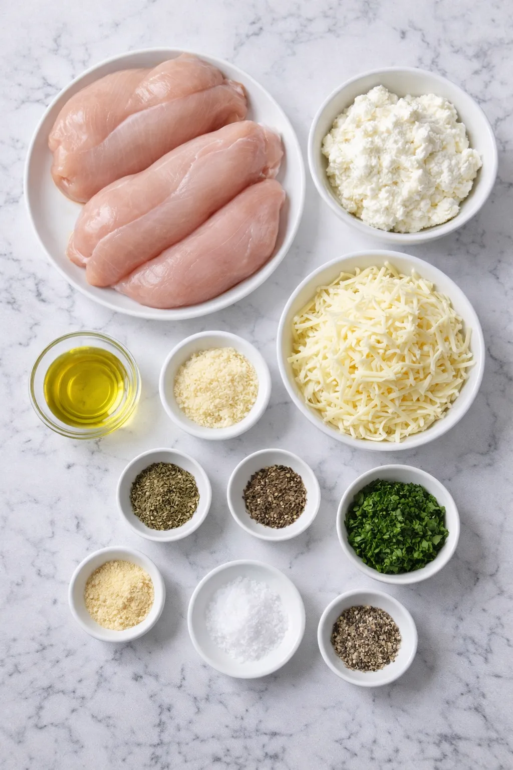 Spoon the ricotta mixture generously over each chicken breast, spreading it evenly. Top each portion with shredded mozzarella and a sprinkle of grated Parmesan.