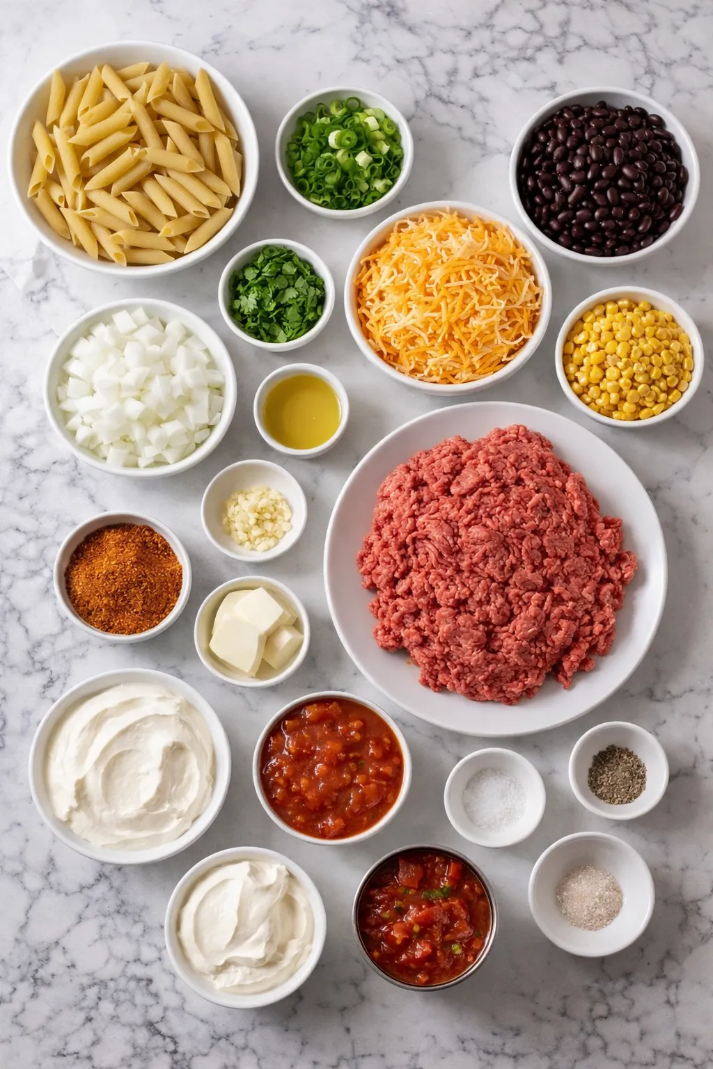 The magic of Baked Taco Pasta is in the mix of textures and flavors. The pasta gives the dish body, the taco-seasoned beef adds richness, and the cheese melts into the sauce for that classic baked casserole finish. A little salsa or tomatoes brighten the whole thing, while corn and peppers add sweetness and color.