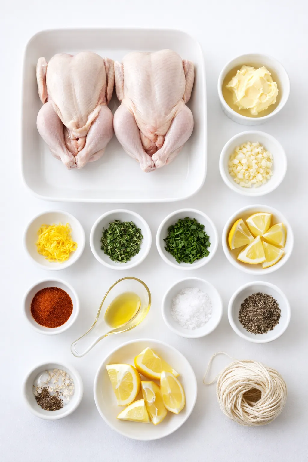 Stuff each hen with a lemon wedge and extra herb sprigs. Tie the legs together with kitchen twine to help them cook evenly and maintain shape.