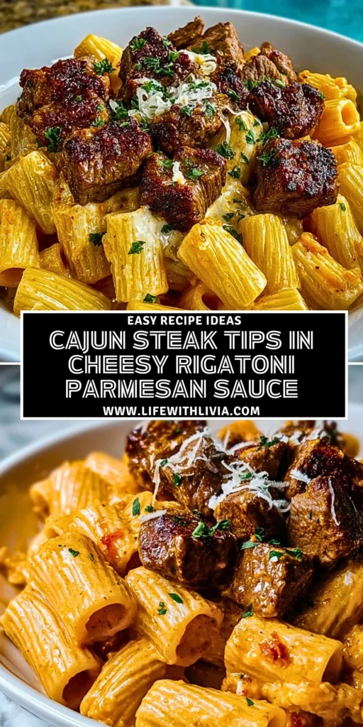 Serve the cheesy rigatoni in bowls and top generously with the Cajun steak tips. Garnish with fresh parsley and an extra sprinkle of Parmesan if desired.