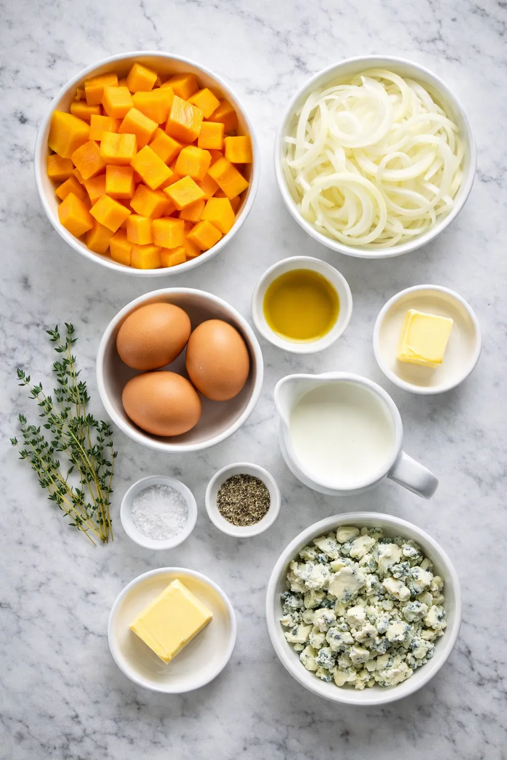 Pour the filling into the baked crust. Top with the remaining onions and squash, and sprinkle with crumbled blue cheese. Bake at 375°F (190°C) for 30-35 minutes until the center is set.