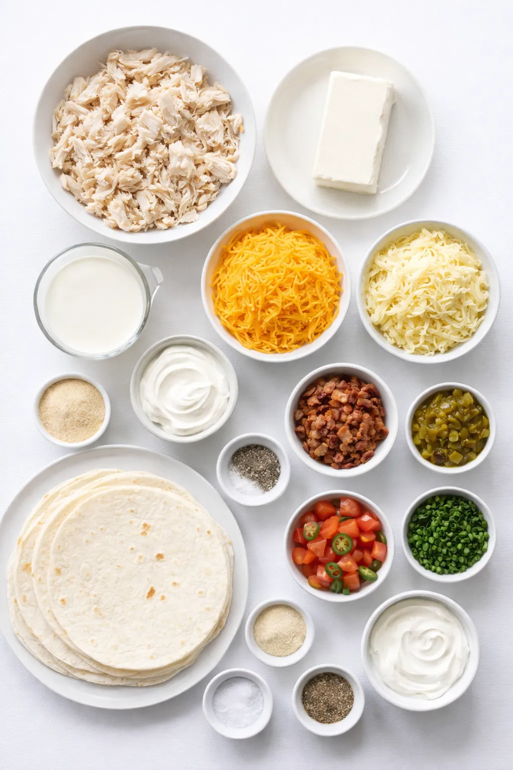 Lay out 8 flour tortillas. Divide the chicken filling evenly among the tortillas and roll them up. Place them seam-side down in a greased 9×13-inch baking dish.