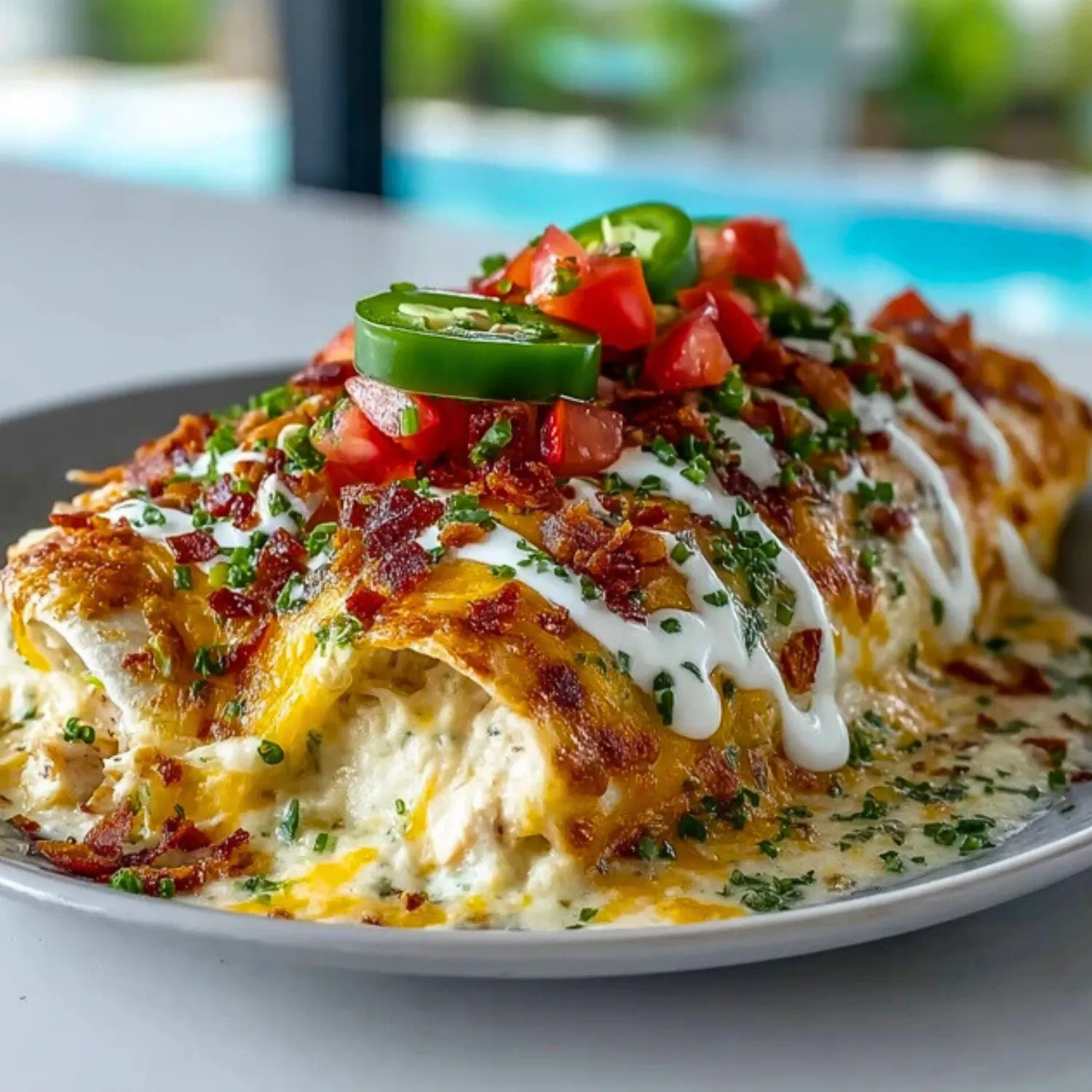 Top with a drizzle of sour cream, freshly chopped tomatoes, sliced jalapeños, and chives. Serve hot and enjoy!