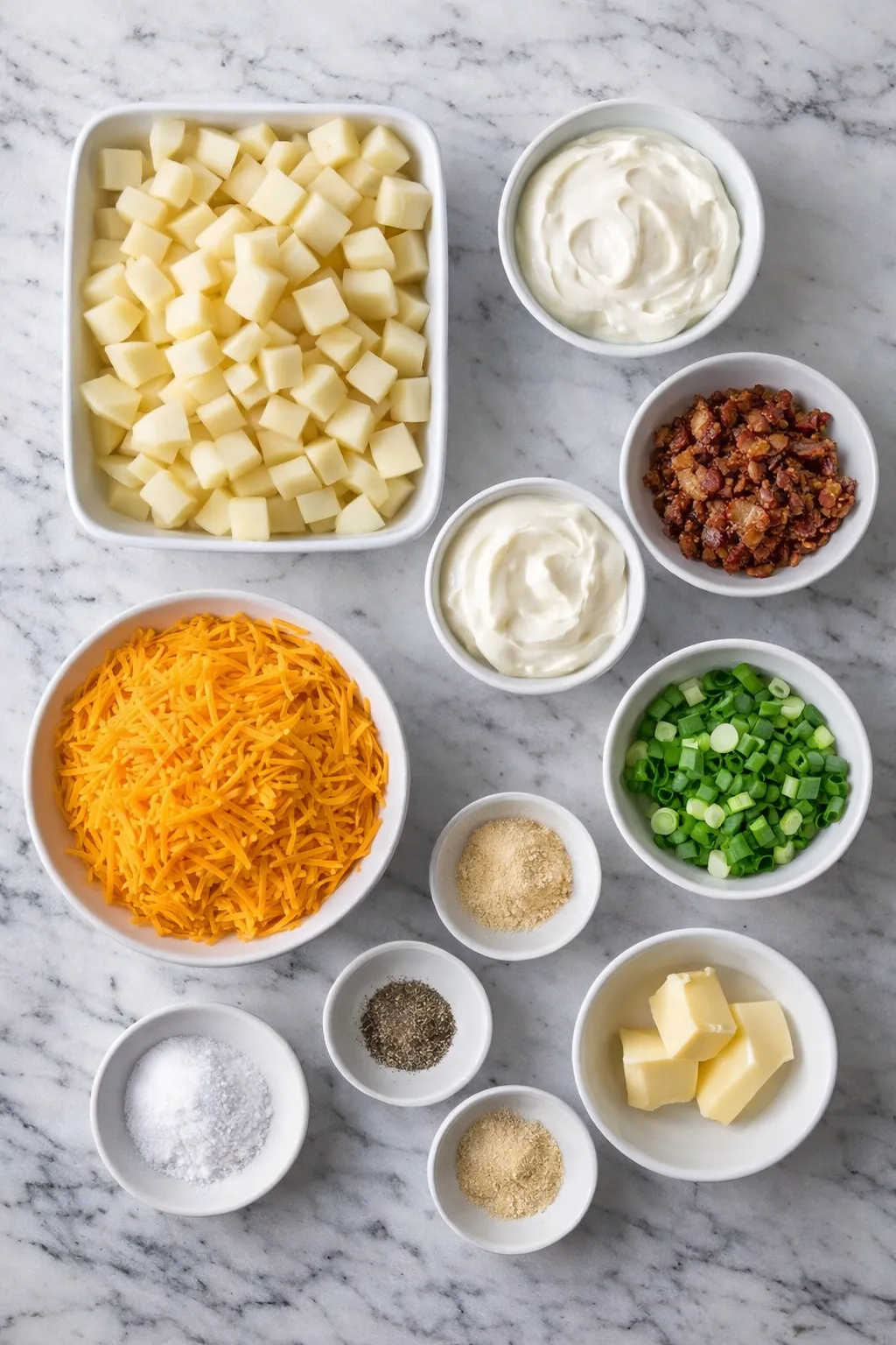 - Mayonnaise – boosts the richness and helps bind the potato mixture so it bakes up smooth instead of dry.