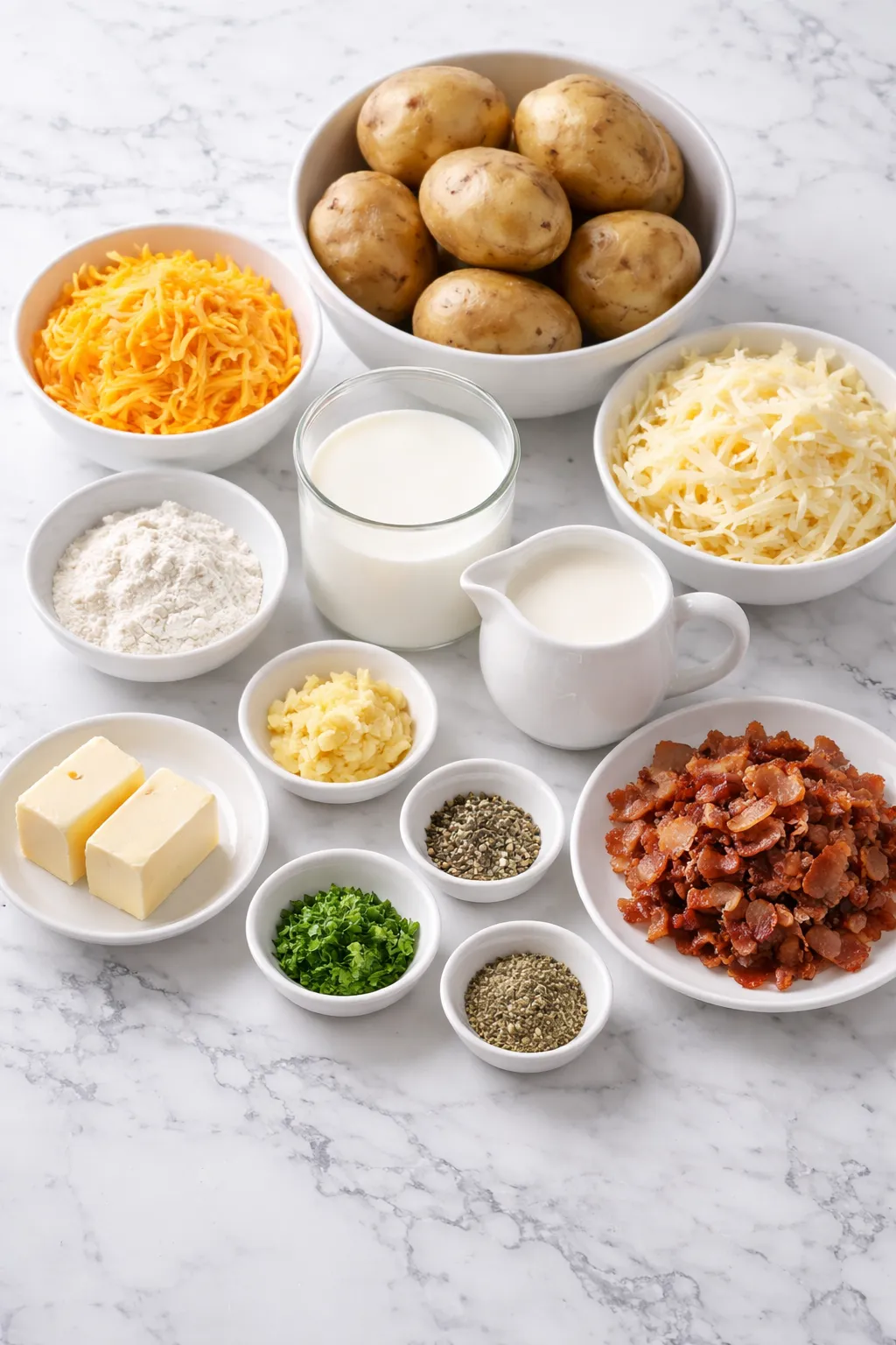 A good Cheesy Potatoes Au Gratin starts with a few simple ingredients that each play an important role in the final texture and flavor.