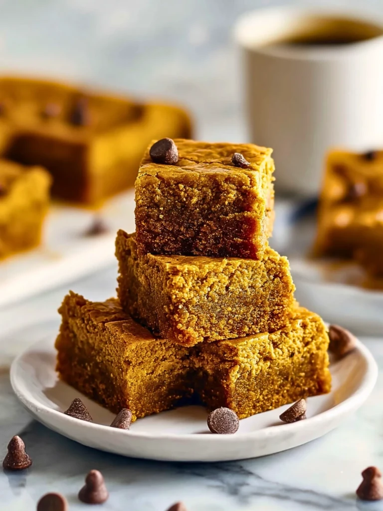 Golden, gooey, and irresistibly spiced, these Chewy Pumpkin Blondies with Warm Spices are the perfect cozy treat for fall and beyond. With their soft, fudgy texture and bursts of rich pumpkin flavor layered with cinnamon, nutmeg, and cloves, these bars are like biting into autumn bliss. Topped with melty chocolate chips, each square offers a comforting balance of sweetness and spice that will keep you coming back for more.
