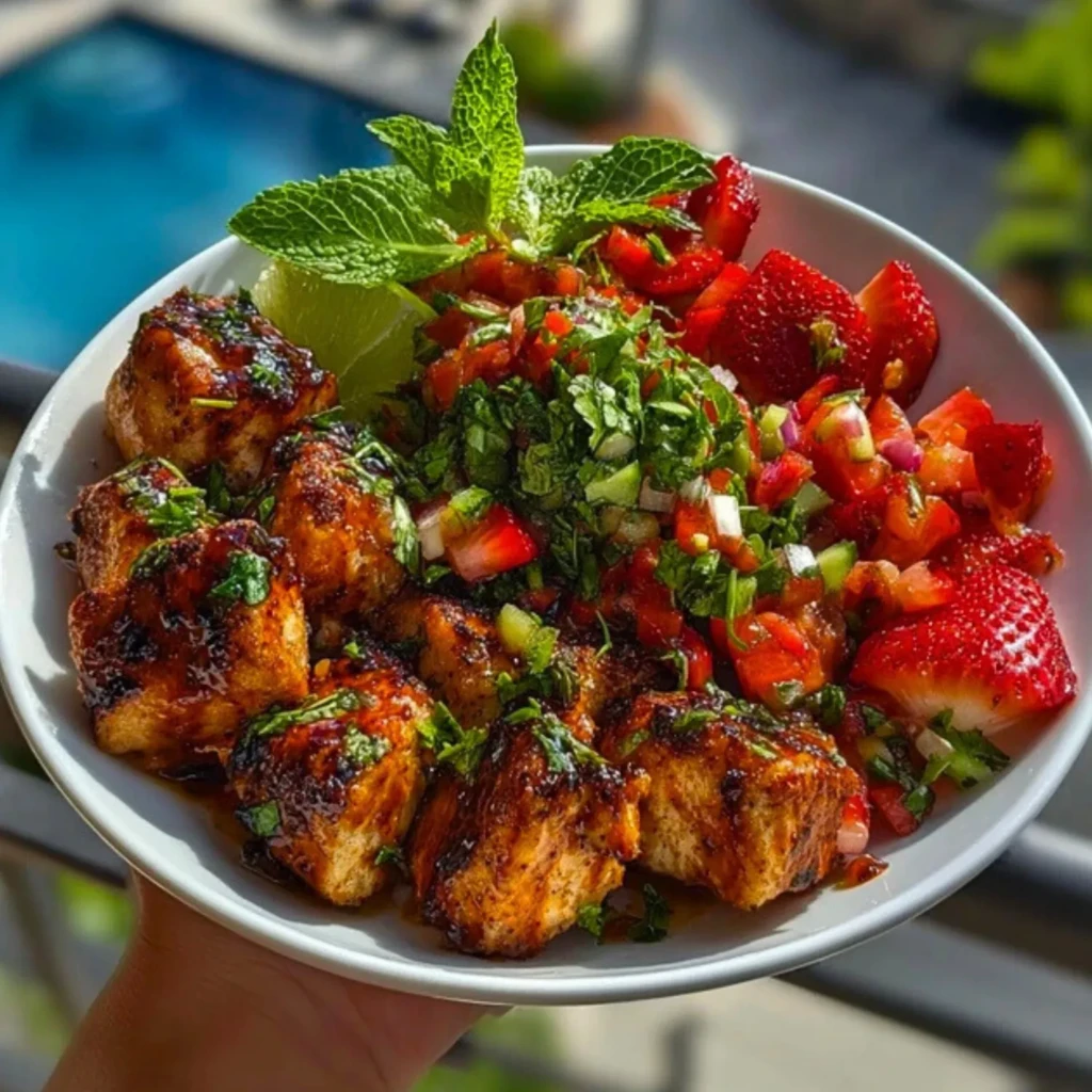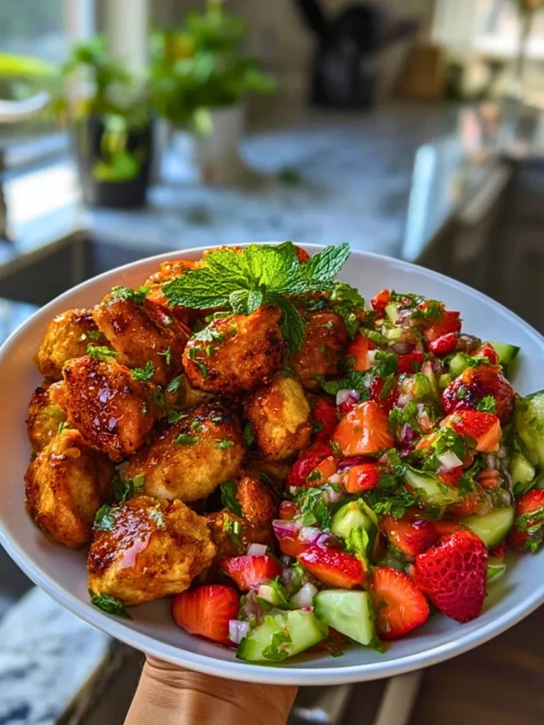 Sweet, spicy, fresh, and satisfying – this Chicken Bites with Strawberry-Jalapeño Mint Salsa Bowl is the kind of dish that turns a regular meal into something worth remembering. Tender, seasoned chicken bites are pan-seared until golden, then paired with a refreshingly bright salsa made with juicy strawberries, crisp cucumbers, fiery jalapeños, and cool mint. Every bite packs bold flavors that dance together like summer on a plate.