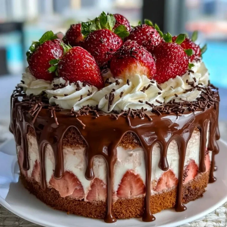 Each bite combines the freshness of strawberries, the creaminess of whipped frosting, and the smooth melt of chocolate in perfect harmony. Whether you’re celebrating a special occasion, planning a romantic dessert, or just want to impress your dinner guests, this cake delivers a perfect balance of flavor and texture with irresistible visual appeal.