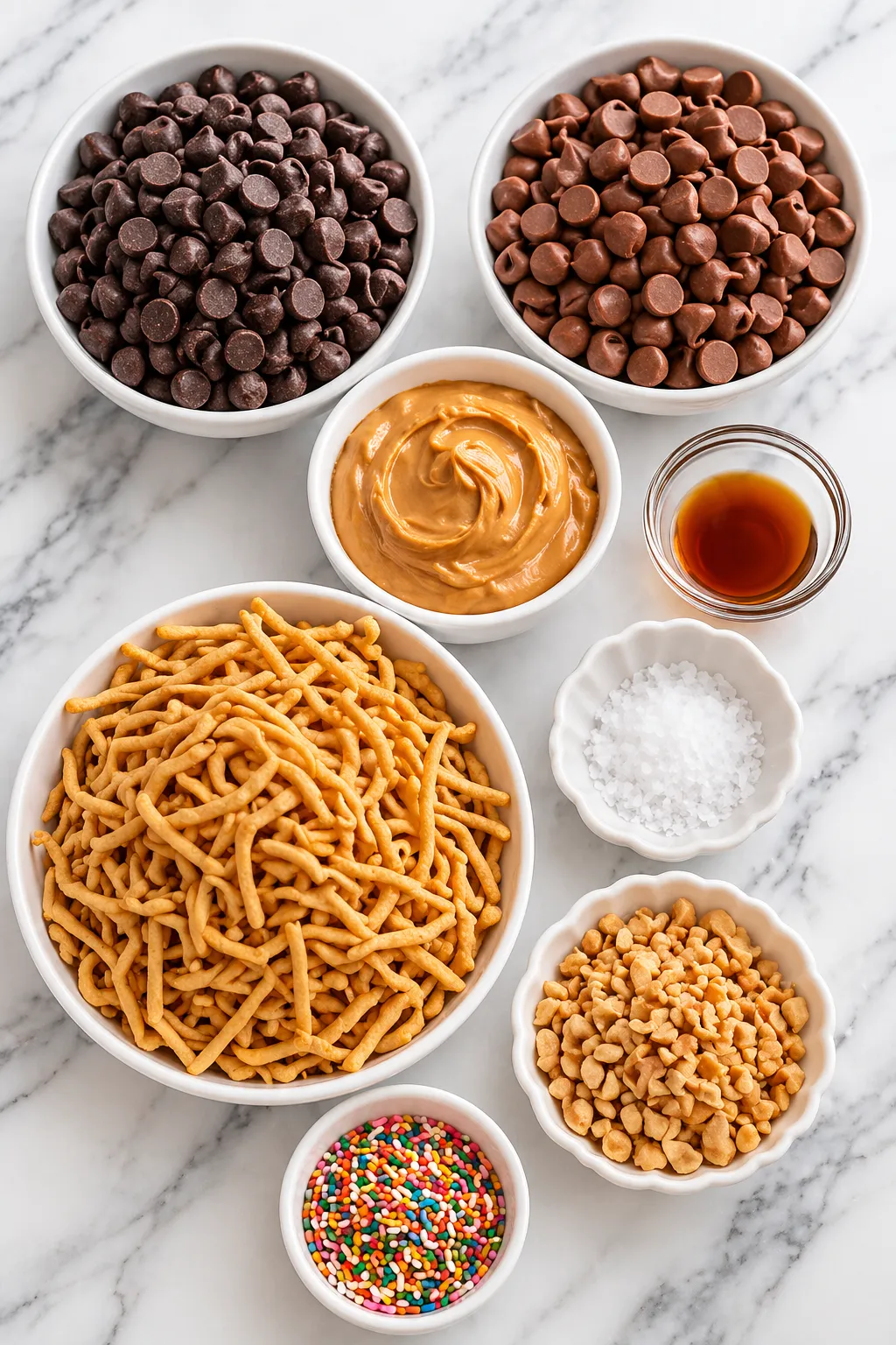 These Chocolate Haystacks use simple ingredients, but each one matters for the final texture. The chocolate creates the coating, the noodles bring crunch and shape, and the optional add-ins help you make them sweeter, nuttier, or more festive.