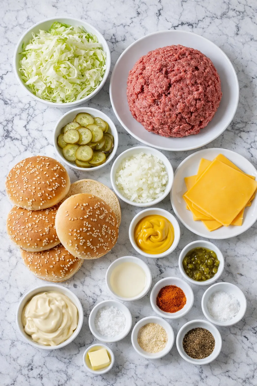 Before you start cooking, it helps to have every burger component ready to go. Since this is a layered sandwich, each ingredient matters and contributes to the classic fast-food texture and flavor.