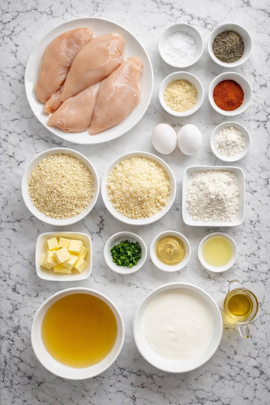 - All-purpose flour – Lightly coats the chicken so the egg and breadcrumb mixture adhere properly.