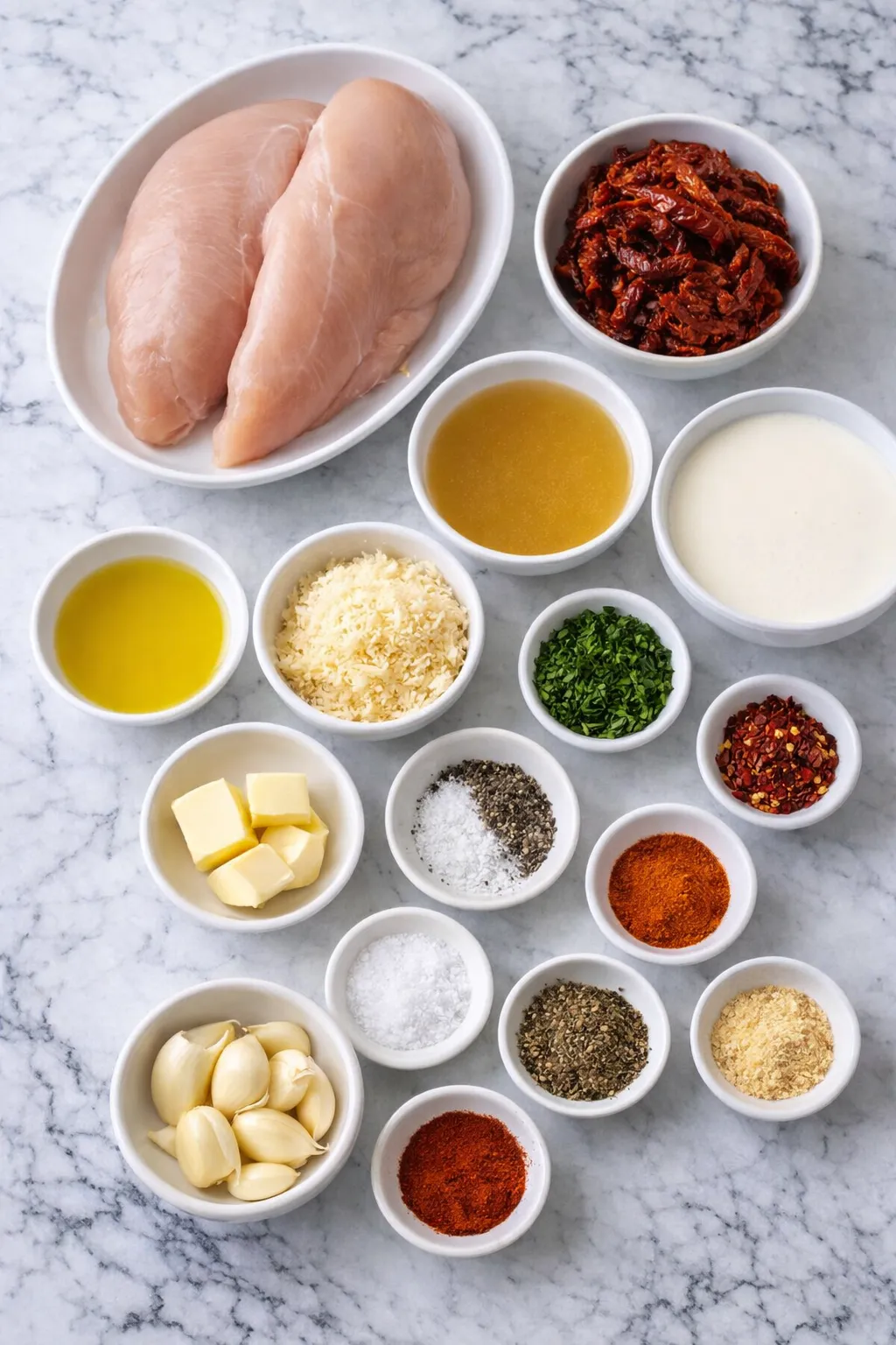 Before you start cooking, it helps to gather everything so the skillet process moves smoothly. Each ingredient in this Creamy Sun-Dried Tomato Garlic Chicken plays an important role, whether it builds the sauce, seasons the chicken, or adds richness to the final dish.