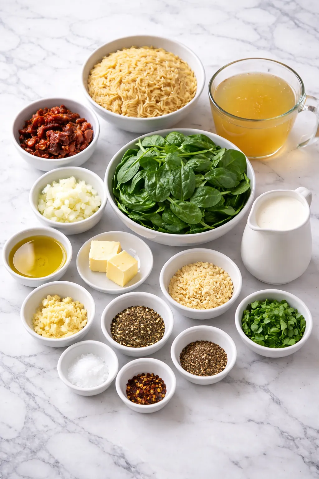 Before making Creamy Tuscan Orzo, have your ingredients prepped and ready to go. Because orzo cooks fairly quickly, the recipe moves smoothly once everything is in the pan.