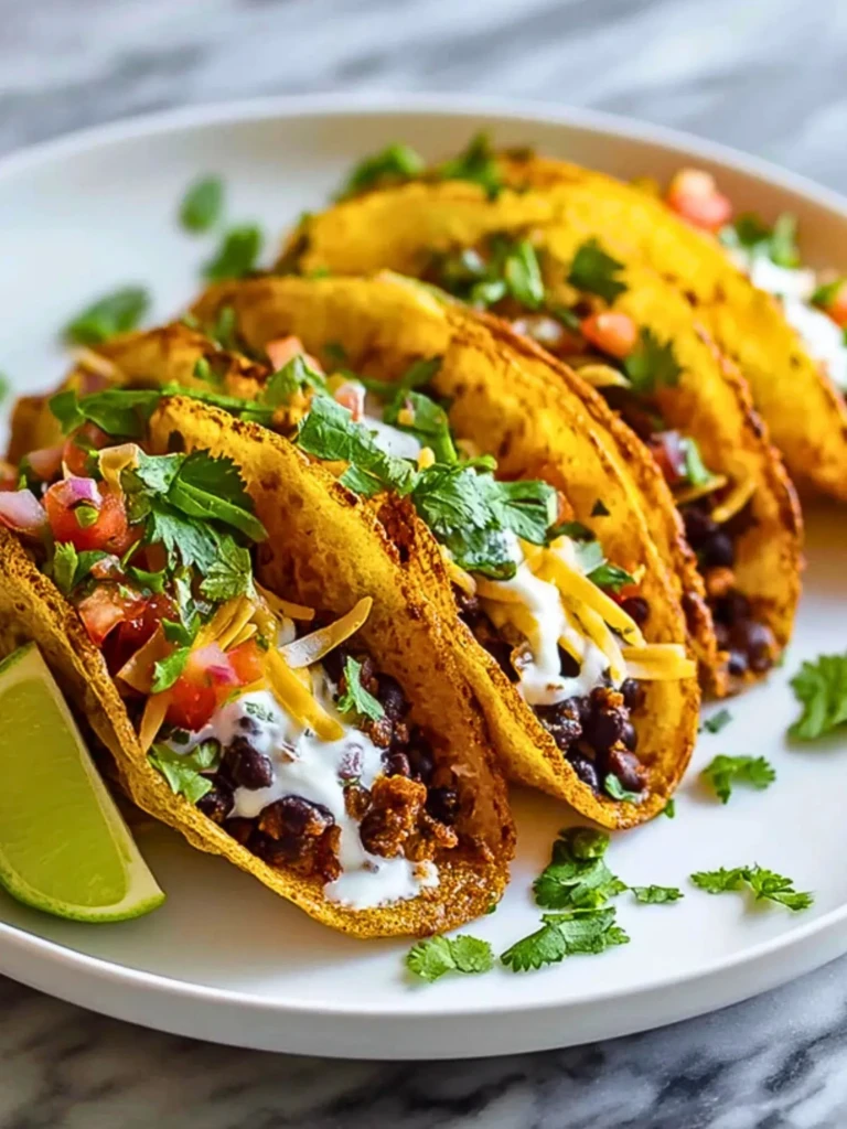 Crispy Black Bean Tacos are the weeknight dinner hero you didn’t know you needed. These golden, pan-fried taco shells are stuffed to perfection with a savory mixture of seasoned black beans, melty cheese, and fresh toppings like sour cream, cilantro, and pico de gallo. They’re satisfyingly crunchy on the outside and bursting with bold, zesty flavor on the inside.