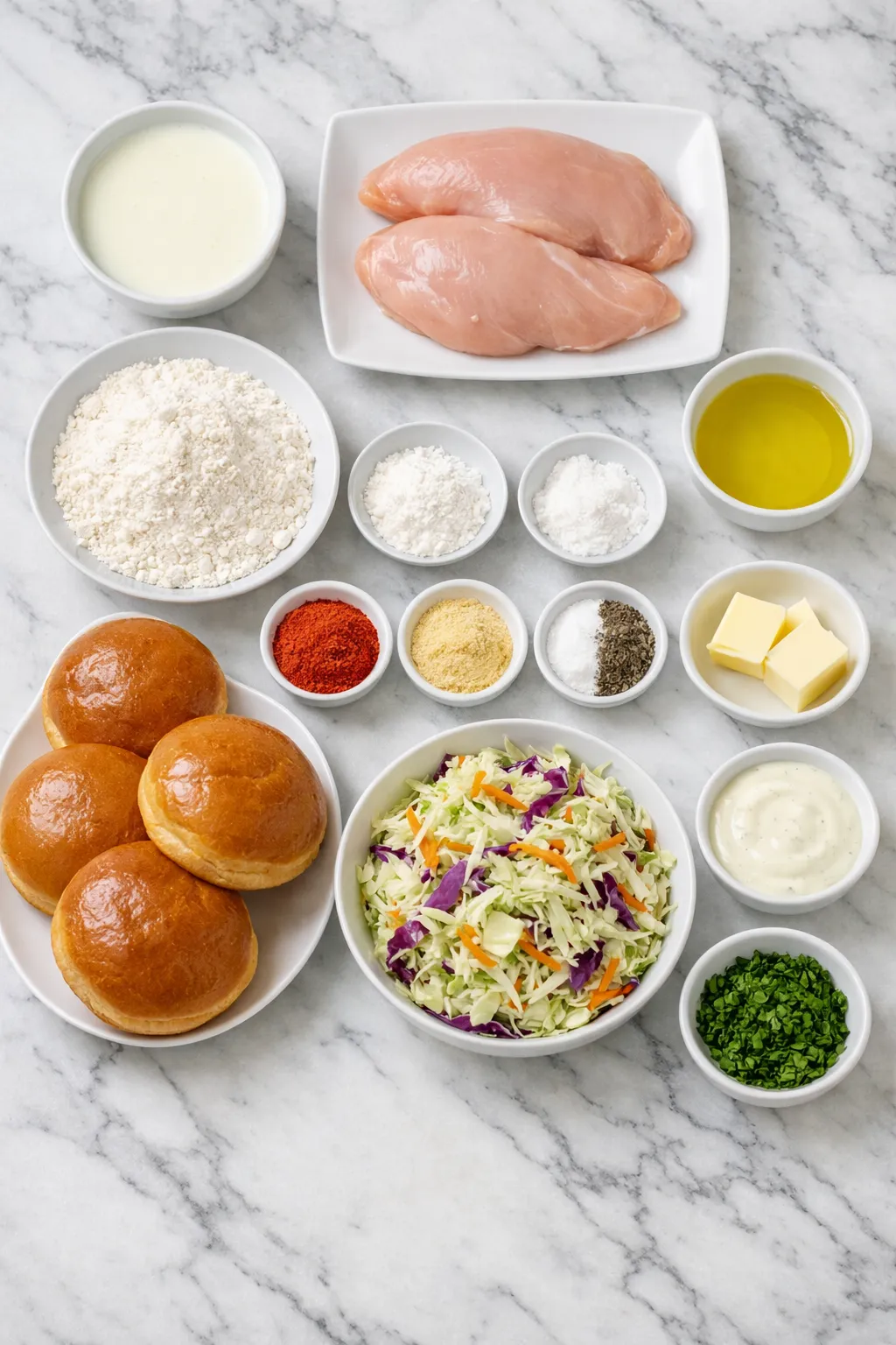 Ingredients for the Crispy Buffalo Chicken Sandwich with Ranch Slaw