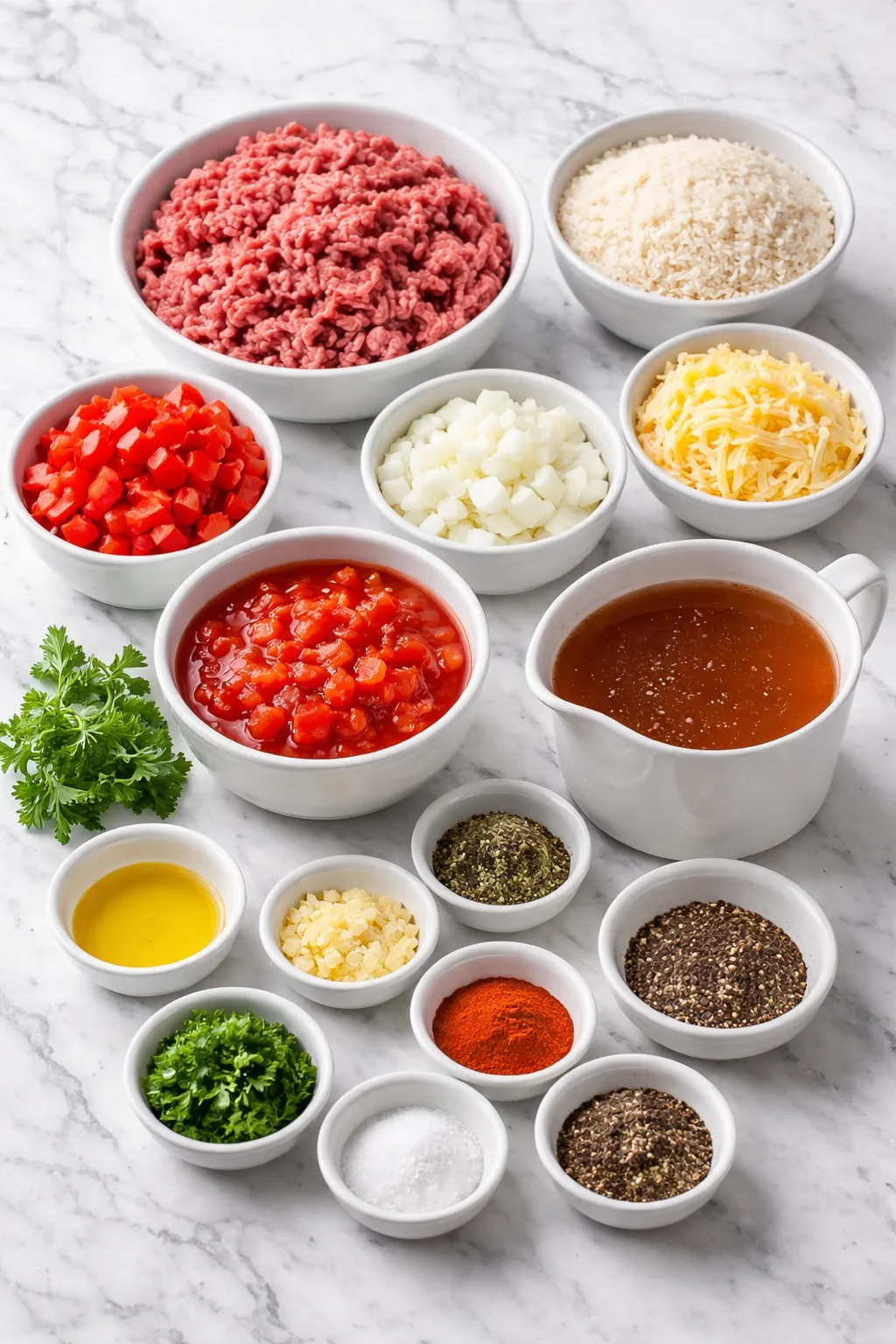 - Ground beef – the hearty base of the dish, adding rich flavor and plenty of protein.