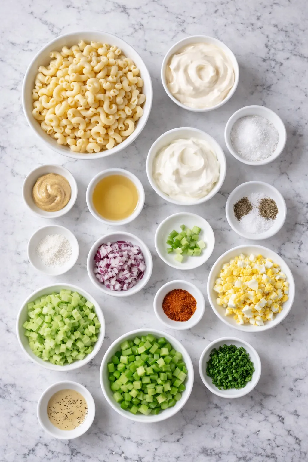 - Elbow macaroni – The base of the salad, providing soft chew and structure.