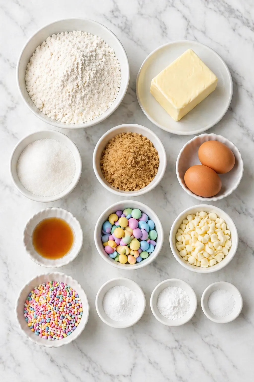 Before you start mixing, gather your chilled and room-temperature ingredients so the dough comes together smoothly. Each ingredient plays a specific part in creating cookies that stay soft in the middle, lightly golden around the edges, and colorful enough for an Easter dessert tray.