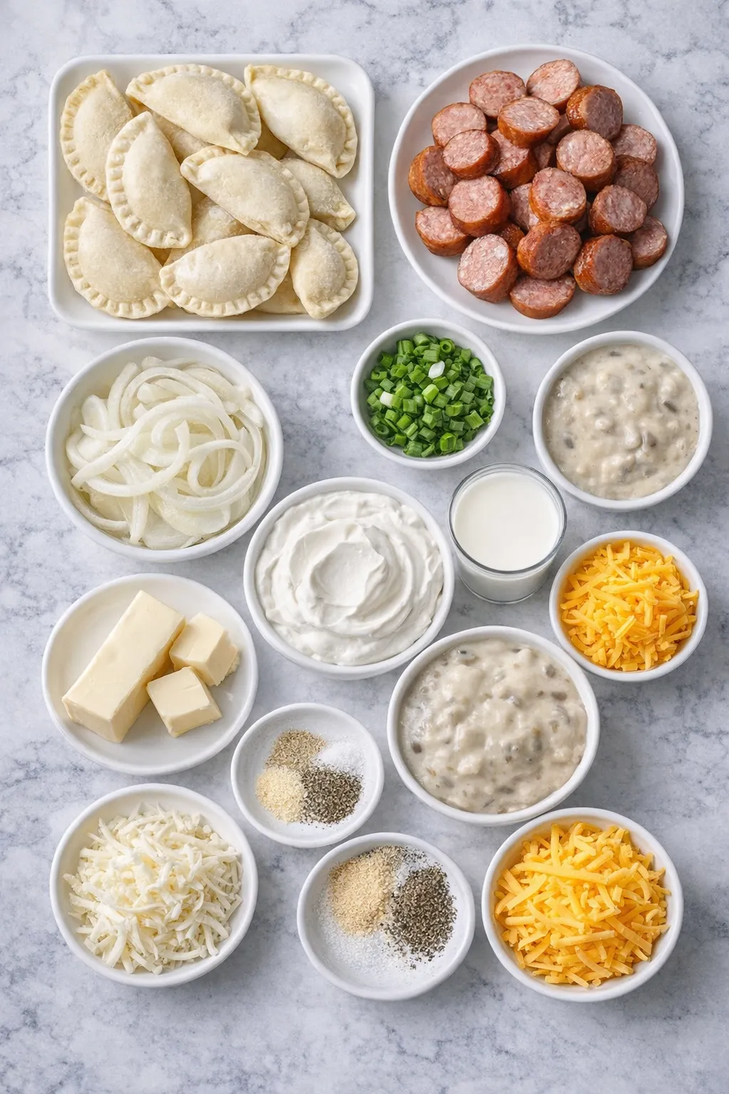 - Pierogi — the hearty base of the casserole, bringing soft potato-filled bites that make the dish extra satisfying.
