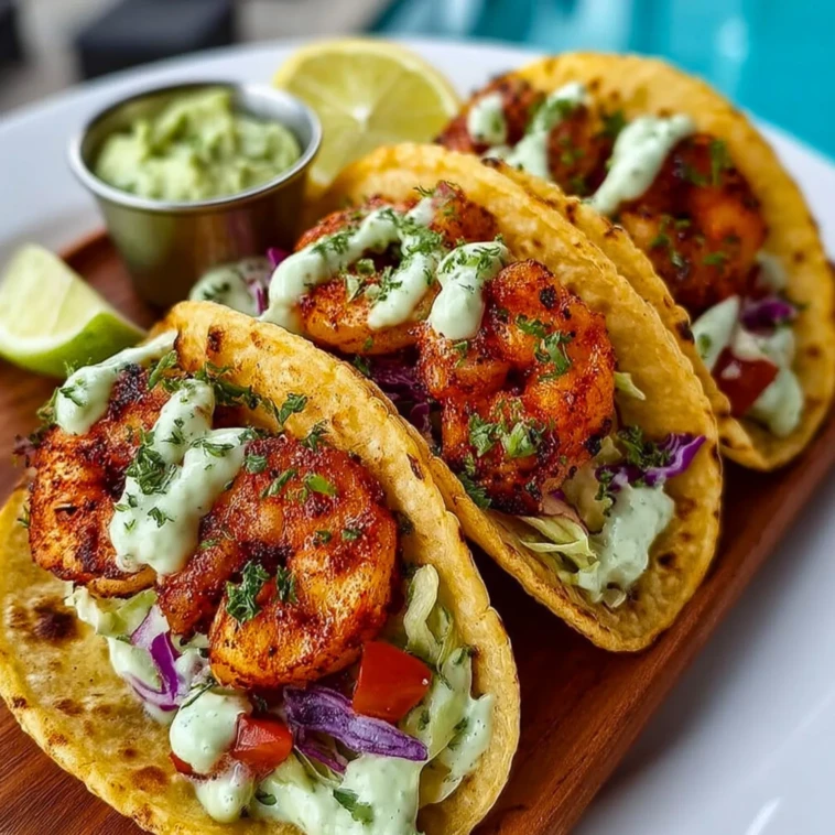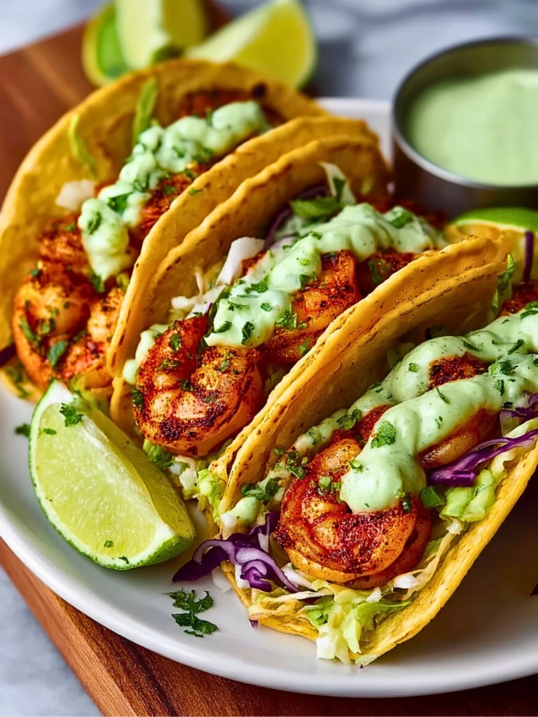 These Easy Shrimp Tacos with Homemade Avocado Crema are a quick dinner win! Juicy shrimp seasoned with bold spices, nestled in toasted corn tortillas, topped with crisp cabbage and juicy tomatoes, then finished with a refreshing avocado crema. Perfect for those searching for easy dinner ideas, quick meals, or healthy taco night options. This recipe is ideal for busy weeknights, outdoor gatherings, or when you want a fresh twist on seafood tacos. Great as a healthy snack or easy recipe packed with flavor.