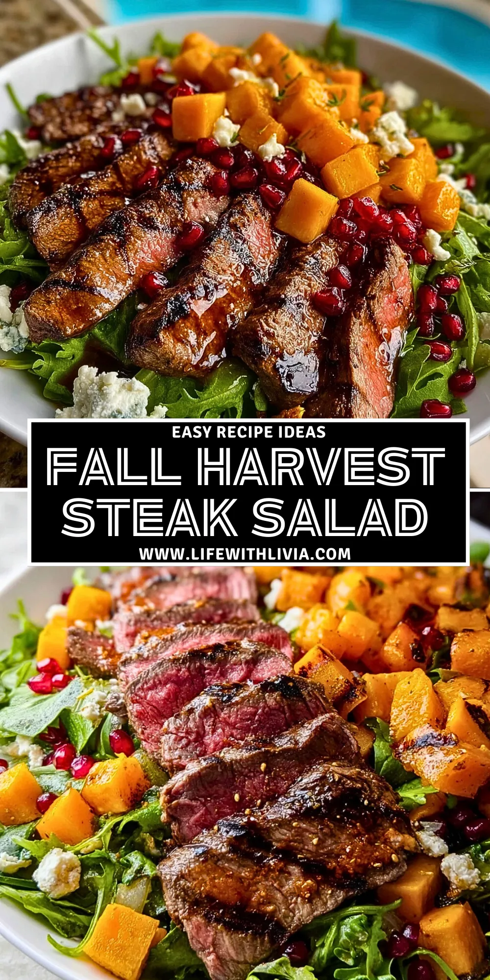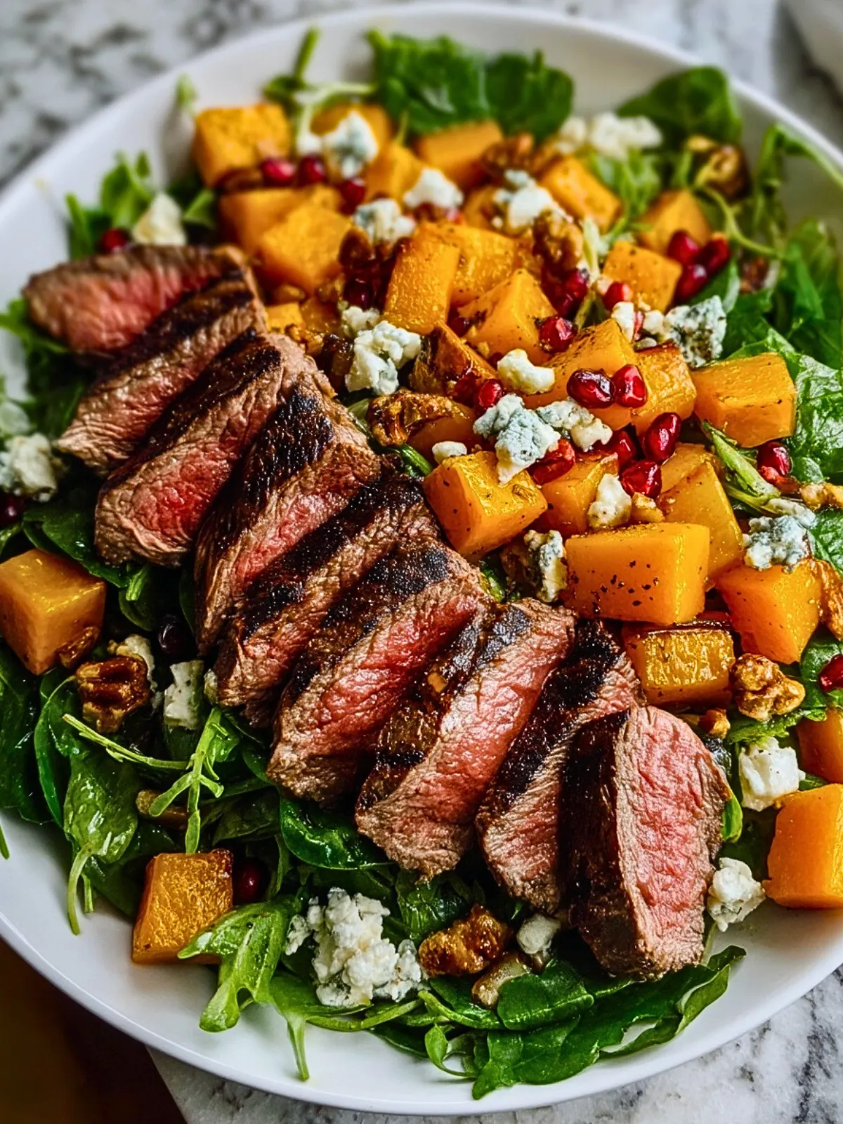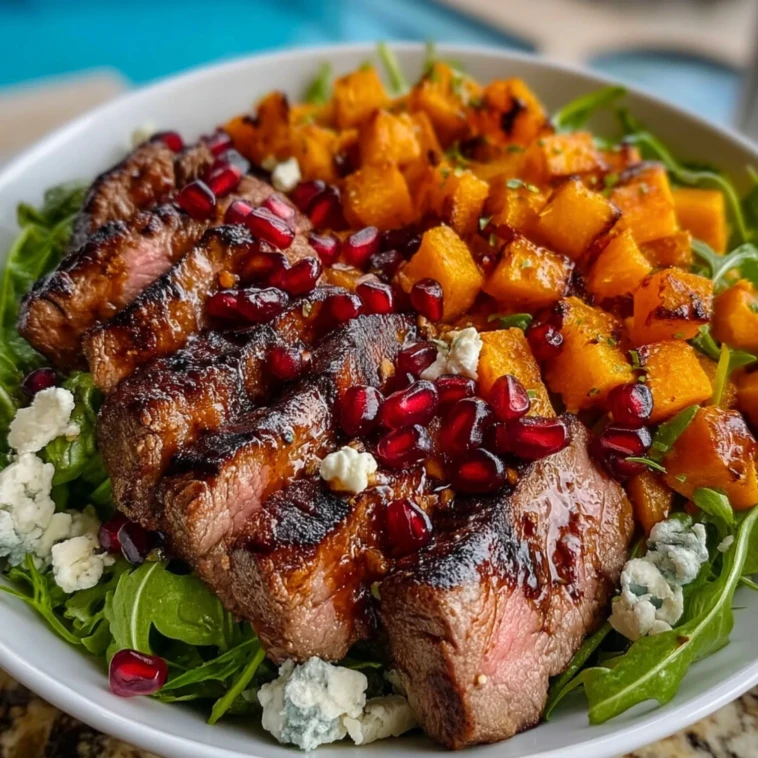Juicy slices of perfectly seared steak, caramelized roasted butternut squash, and tart bursts of pomegranate seeds come together in this cozy yet refreshing Fall Harvest Steak Salad. It’s a stunning celebration of autumn on a plate — rich, vibrant, and nourishing. Layered over a bed of peppery arugula and finished with creamy crumbles of blue cheese, this salad is a hearty and colorful main course you’ll crave all season.