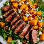 Juicy slices of perfectly seared steak, caramelized roasted butternut squash, and tart bursts of pomegranate seeds come together in this cozy yet refreshing Fall Harvest Steak Salad. It’s a stunning celebration of autumn on a plate — rich, vibrant, and nourishing. Layered over a bed of peppery arugula and finished with creamy crumbles of blue cheese, this salad is a hearty and colorful main course you’ll crave all season.