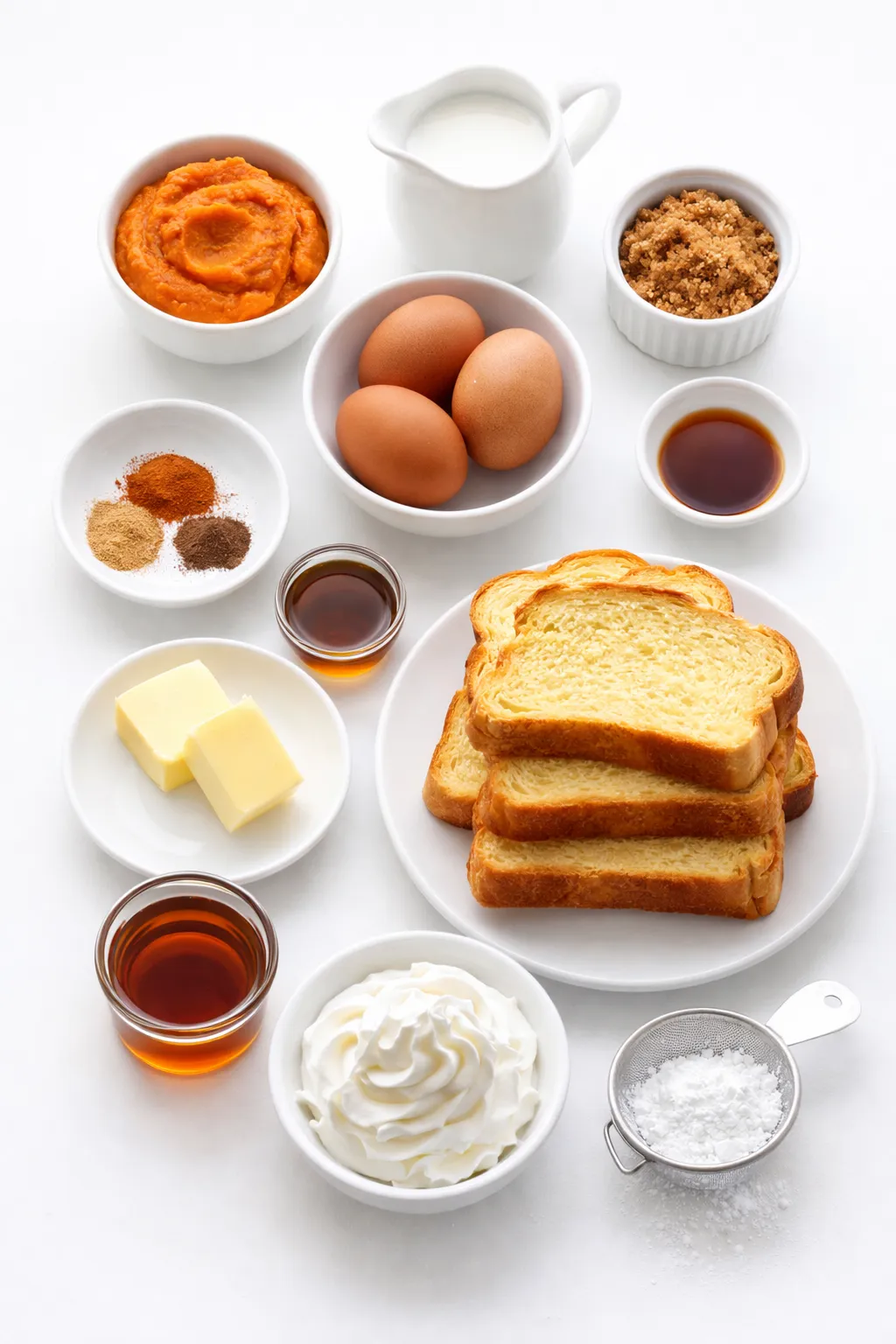 Thick-sliced brioche or challah works best. Their soft texture and slight sweetness complement the pumpkin custard, and they hold up beautifully when soaked. Day-old bread is ideal since it absorbs more of the spiced mixture without getting soggy.