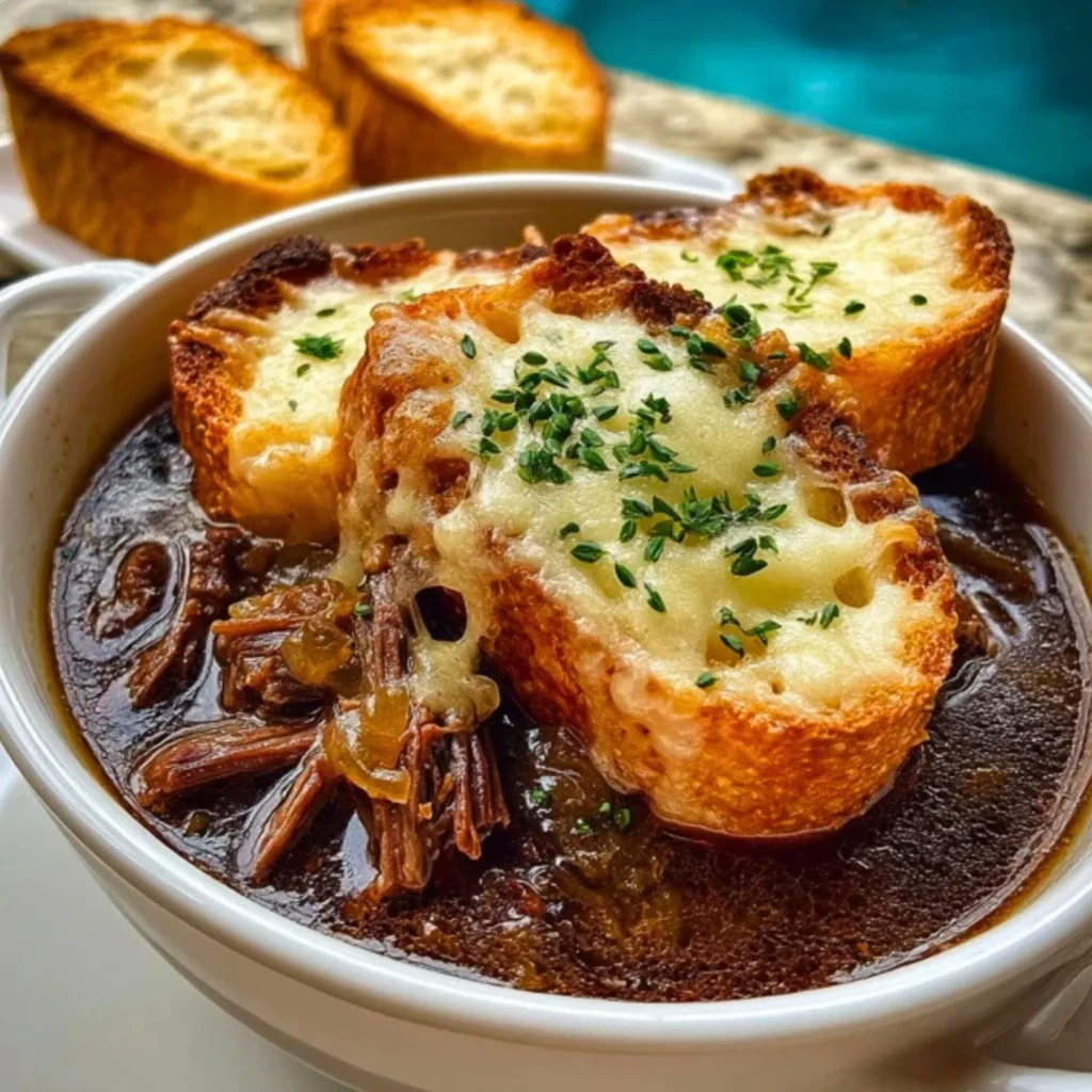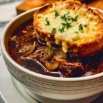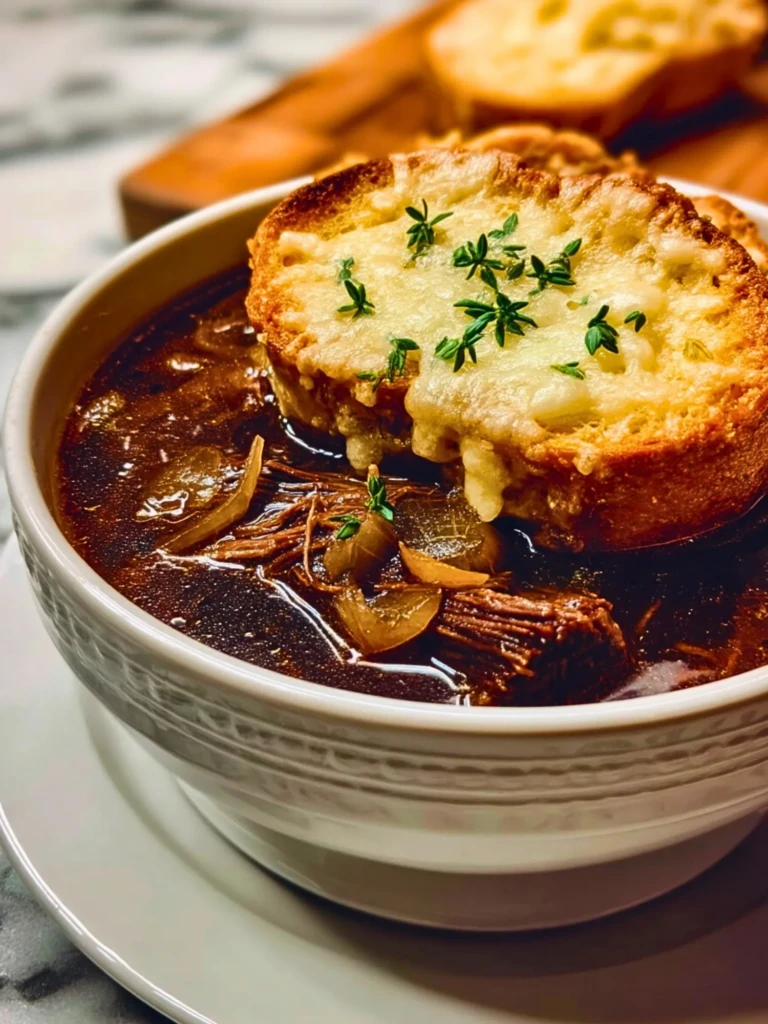 This French Onion Beef Short Rib Soup takes cozy comfort to the next level. Tender, slow-cooked short ribs melt into a deeply flavorful caramelized onion broth, crowned with cheesy toasted baguette slices. Perfect for chilly nights, dinner parties, or a soul-warming meal at home, this dish delivers richness, elegance, and hearty satisfaction in every spoonful. It’s the ultimate upgrade on a classic French onion soup—ideal for easy dinner ideas, one-pot recipes, and comfort food lovers.