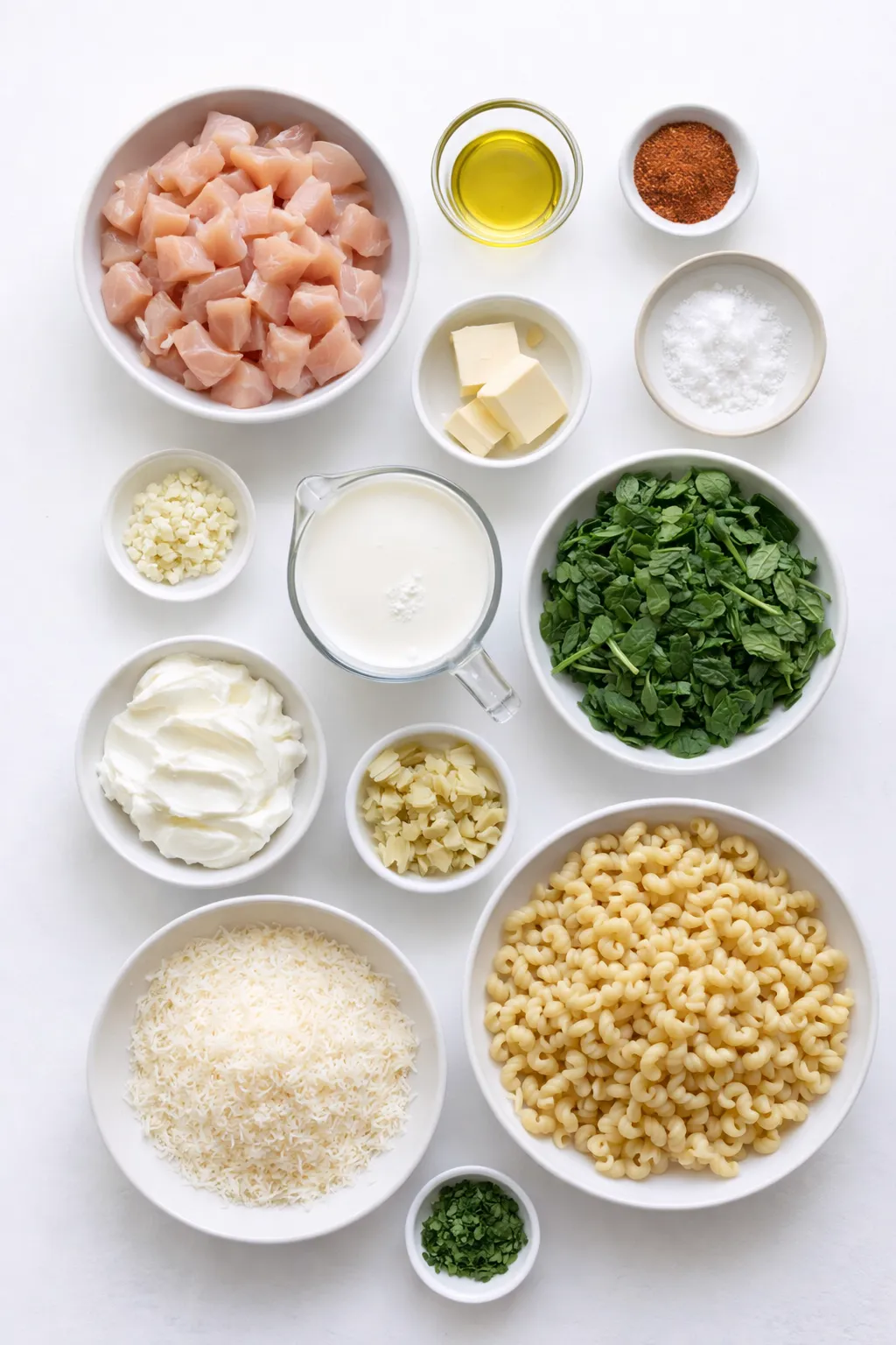Ingredients for the Garlic Chicken Bites and Creamy Cajun Spinach Artichoke Alfredo Pasta