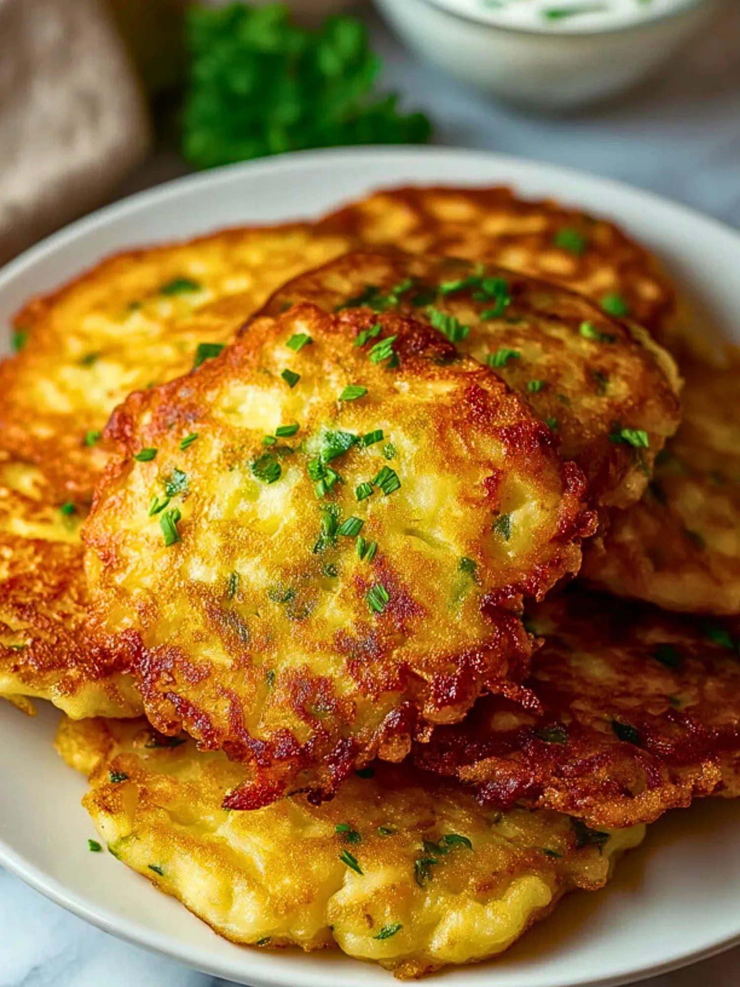 The cool, creamy texture of sour cream with a sprinkle of fresh chives complements the savory richness of the pancakes.