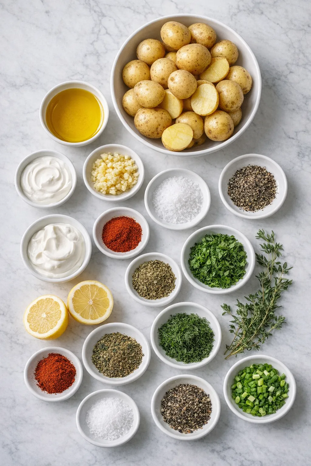 • Fresh dill – Provides bright, grassy freshness on the hot potatoes and in the cool herb dip.