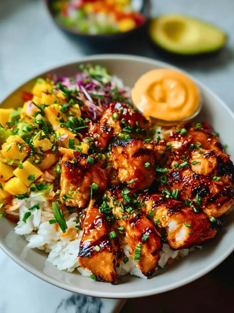 5. Assemble bowls with a scoop of rice, grilled chicken bites, mango avocado salsa, and a dollop of chili mayo. Garnish with chives or green onions.
