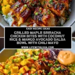 Craving a bold and balanced dish for your next meal prep or quick dinner? These Grilled Maple Sriracha Chicken Bites with Coconut Rice & Mango Avocado Salsa Bowl are packed with sweet heat, tropical freshness, and creamy richness. Juicy grilled chicken is glazed in a sticky maple sriracha sauce, nestled on aromatic coconut rice, and topped with zesty mango avocado salsa and chili mayo. This healthy, easy recipe checks every box — from dinner ideas to food ideas for busy weeknights. It’s a must-try for fans of spicy comfort food, quick meals, and vibrant flavors.
