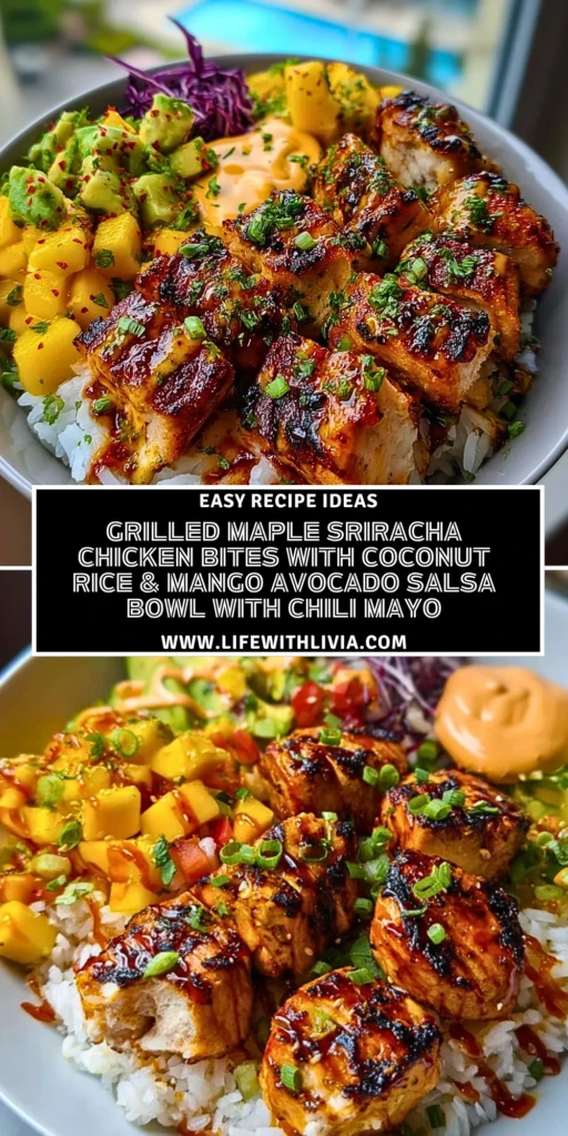 The Grilled Maple Sriracha Chicken Bites with Coconut Rice & Mango Avocado Salsa Bowl is a mouthwatering combination of flavors, colors, and textures that delivers a gourmet experience with minimal fuss. It’s an ideal dinner idea for busy nights or meal prepping ahead, with the added bonus of being adaptable to your dietary needs. Try it once, and it’ll be a new go-to in your easy recipe rotation.