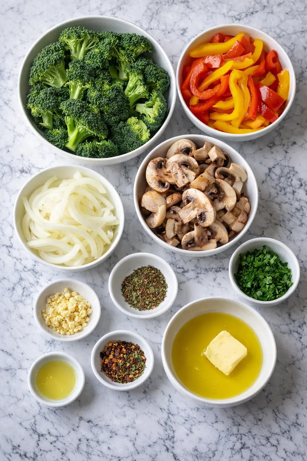 The best vegetables for this dish are the ones that hold their shape and stay appealing after a quick cook in the skillet. Broccoli gives the mix body and a hearty bite, bell peppers add sweetness, mushrooms bring savory depth, and onions soften into a mellow layer of flavor that ties everything together.