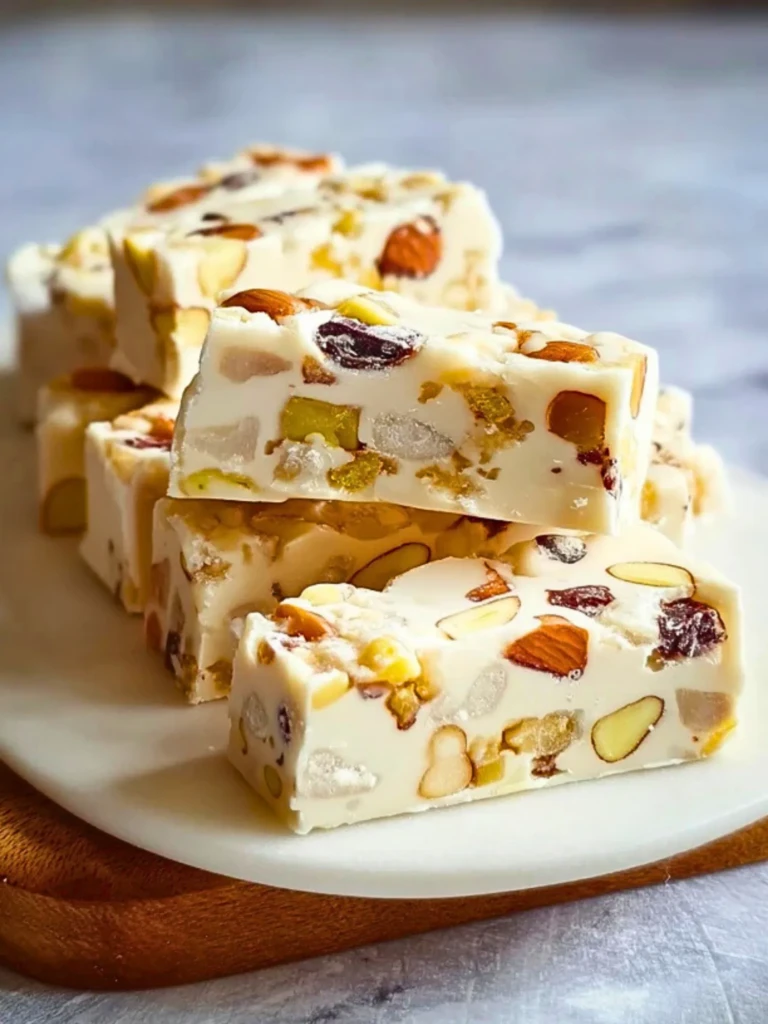 Creamy, chewy, and packed with an irresistible blend of crunchy nuts and jewel-toned dried fruits, these Homemade Nougat Bars are a delightful treat that’s as beautiful as it is delicious. Whether you’re preparing them for a special occasion or simply looking for a unique sweet to share with friends, these nougat bars are sure to impress with their texture and flavor.