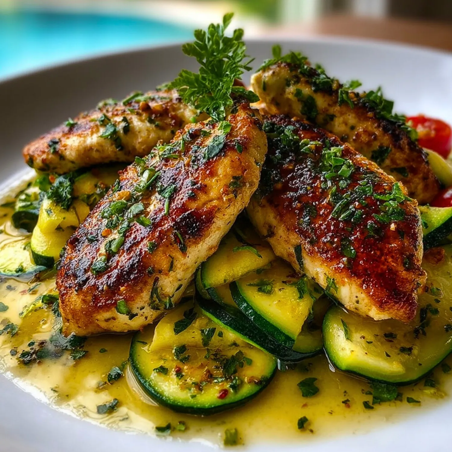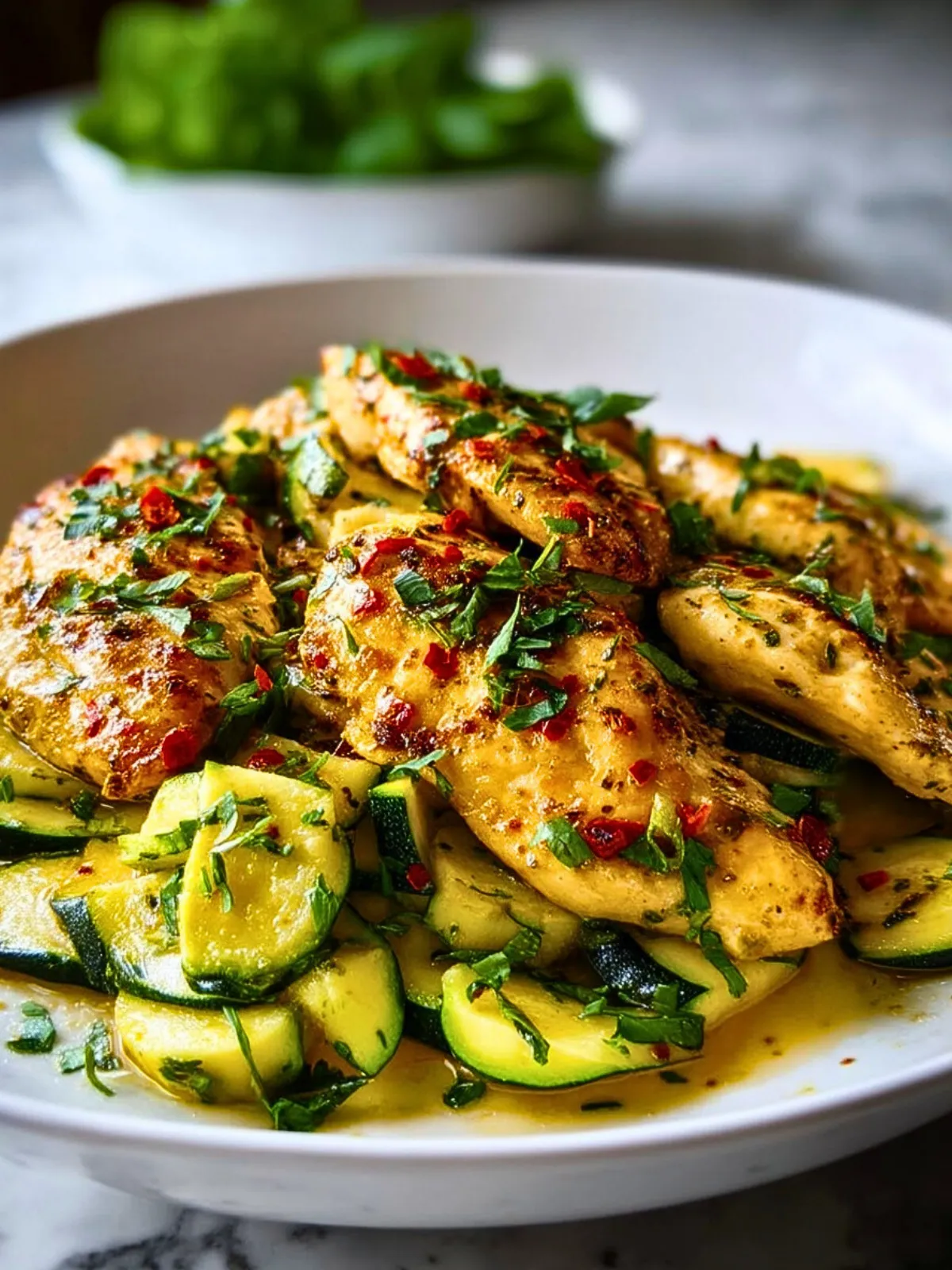 Return the cooked chicken to the pan. Spoon the garlic butter and zucchini mixture over the chicken. Add chopped parsley and a sprinkle of red pepper flakes if desired.