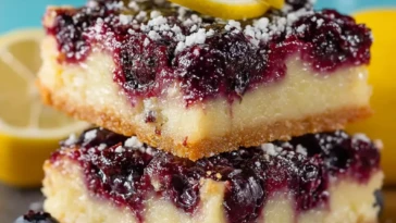 Bright lemon, bursts of juicy blueberries, and a buttery cookie-style crust all in one bite—these Lemon Blueberry Bars are the kind of dessert that disappears long before the pan is empty. The layers bake up into soft, custardy lemon filling topped with glossy berries, finished with a snowfall of powdered sugar.
