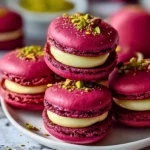 Crisp on the outside, chewy on the inside, and filled with velvety white chocolate ganache — these Luxurious Raspberry Pistachio Macarons are the epitome of elegance and flavor. The rich raspberry shells are subtly tart and beautifully pink, while the creamy center brings a touch of indulgence that melts in your mouth. Topped with crushed pistachios and a light dusting of powdered sugar, they’re visually stunning and absolutely irresistible.