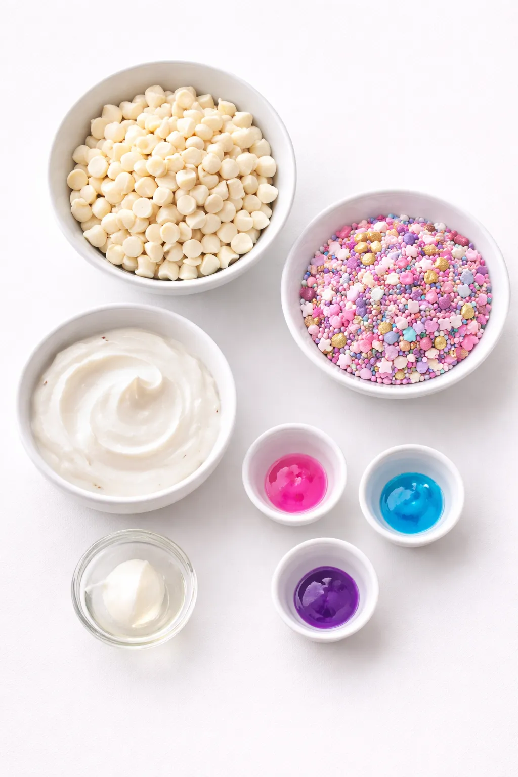 Food Coloring (pink, purple, and blue): These create that beautiful unicorn swirl pattern. Gel-based colorings give the most vibrant results.