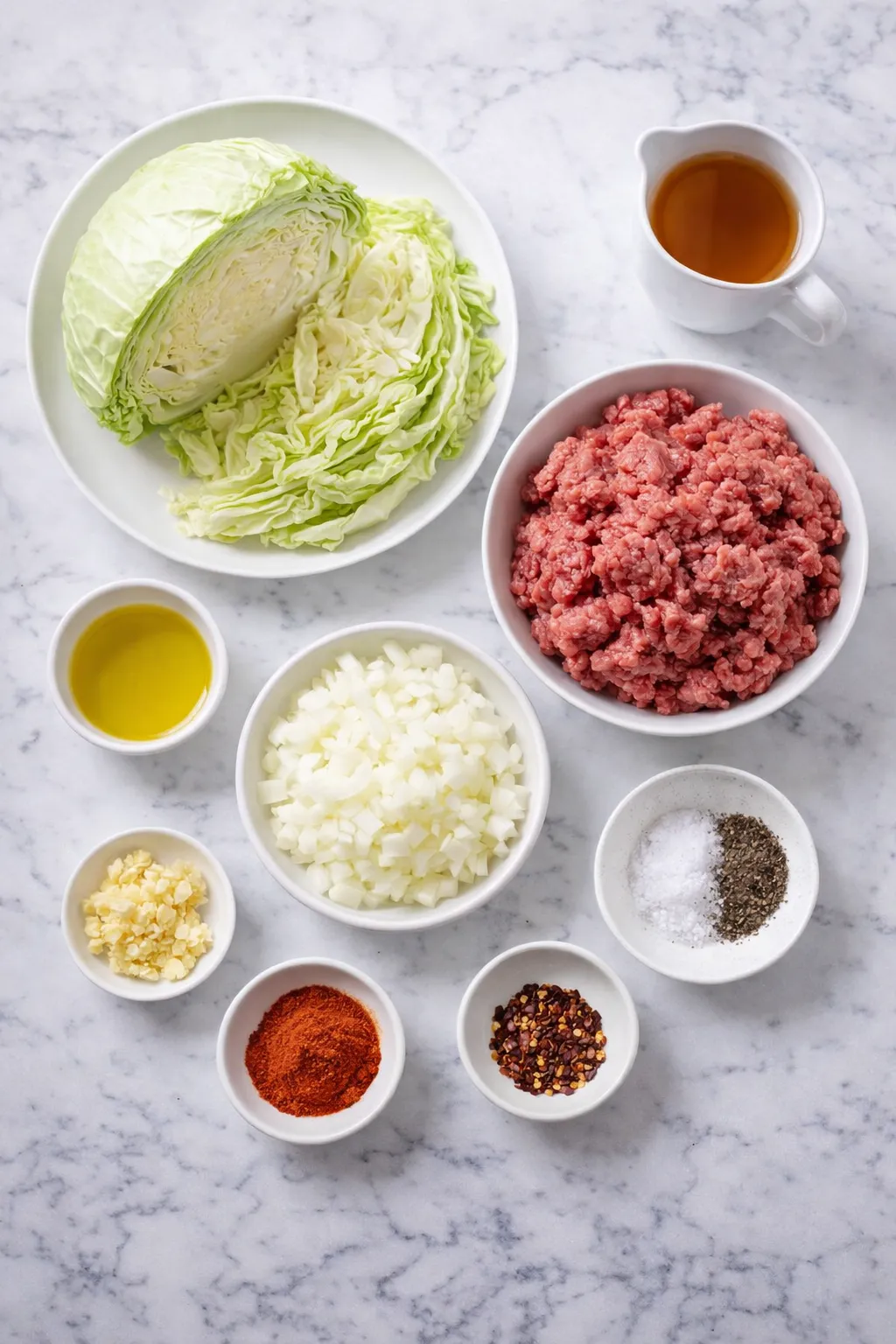 Remove the outer leaves from 1 medium green cabbage (about 2 pounds), core it, and slice it into thin strips. Dice 1 small onion and mince 3 cloves of garlic.
