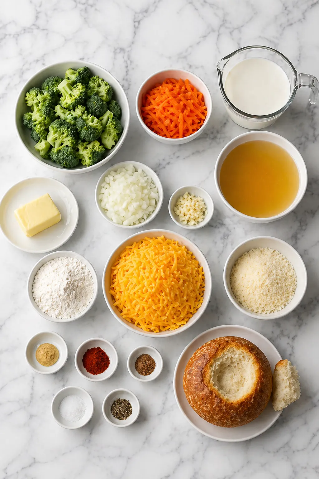 - Carrots — Bring gentle sweetness, bright color, and classic broccoli cheddar soup texture.