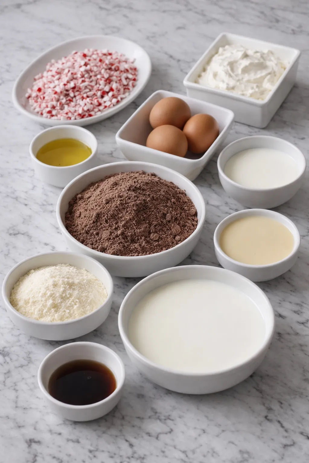 Before you start baking, gather everything you need so the process stays smooth from start to finish. Each ingredient in this Peppermint Poke Cake plays a part in building the soft texture, cool mint flavor, and festive finish that make the dessert stand out.
