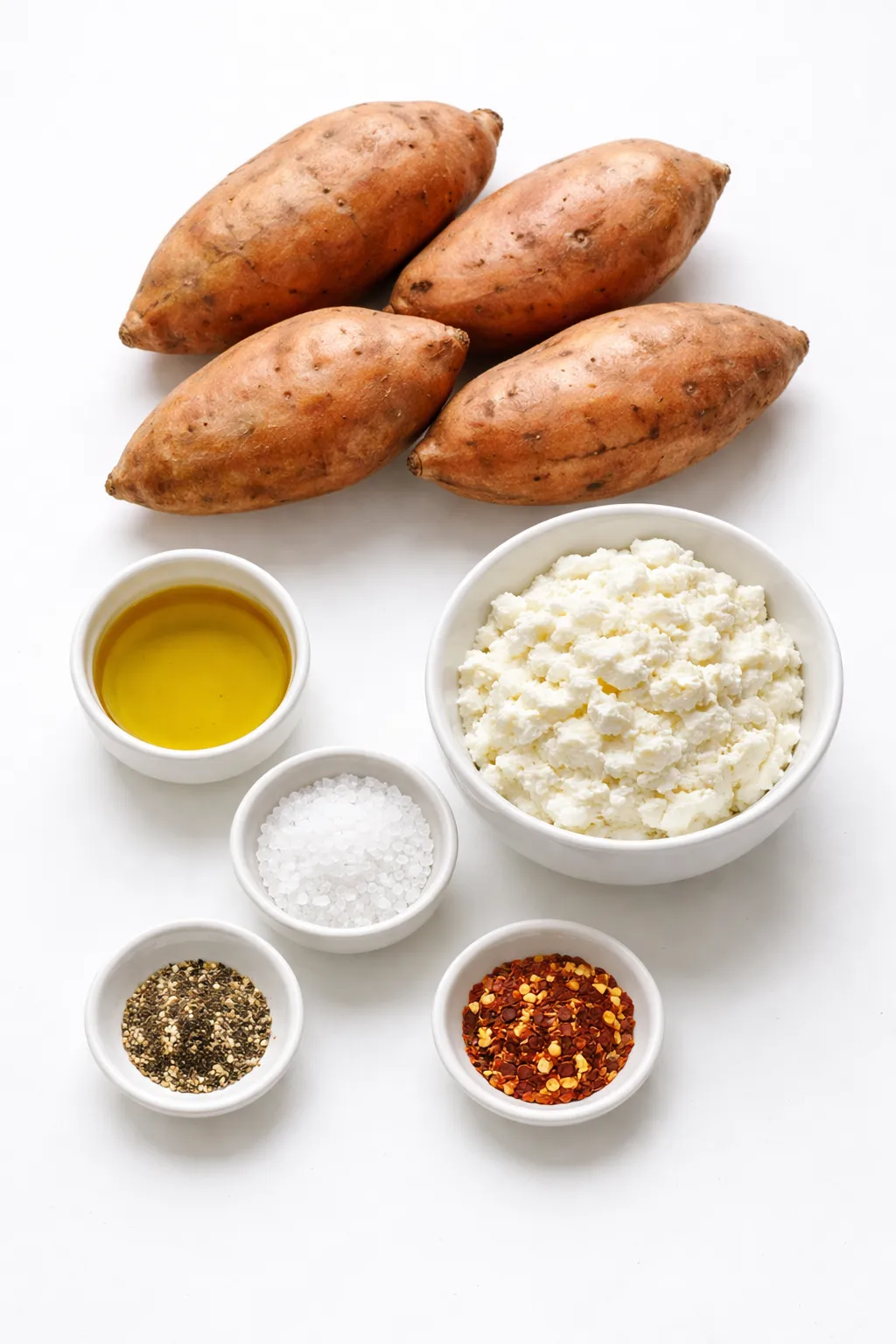 Slice each sweet potato open lengthwise. Use a fork to lightly fluff the inside. Top each one with a generous spoonful of cottage cheese, a pinch of black pepper, and a few chili flakes if you like it spicy.