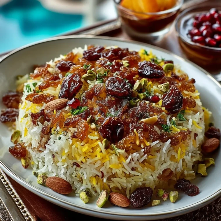 A dazzling crown jewel of Persian cuisine, this Jeweled Rice is a stunning dish that brings together sweet, savory, and aromatic flavors. Fluffy basmati rice is layered with caramelized onions, sweet dried fruits, crunchy nuts, and a touch of warm saffron. It is as visually striking as it is delicious, earning its name from the colorful glint of ingredients like golden raisins, ruby red barberries, emerald pistachios, and more.