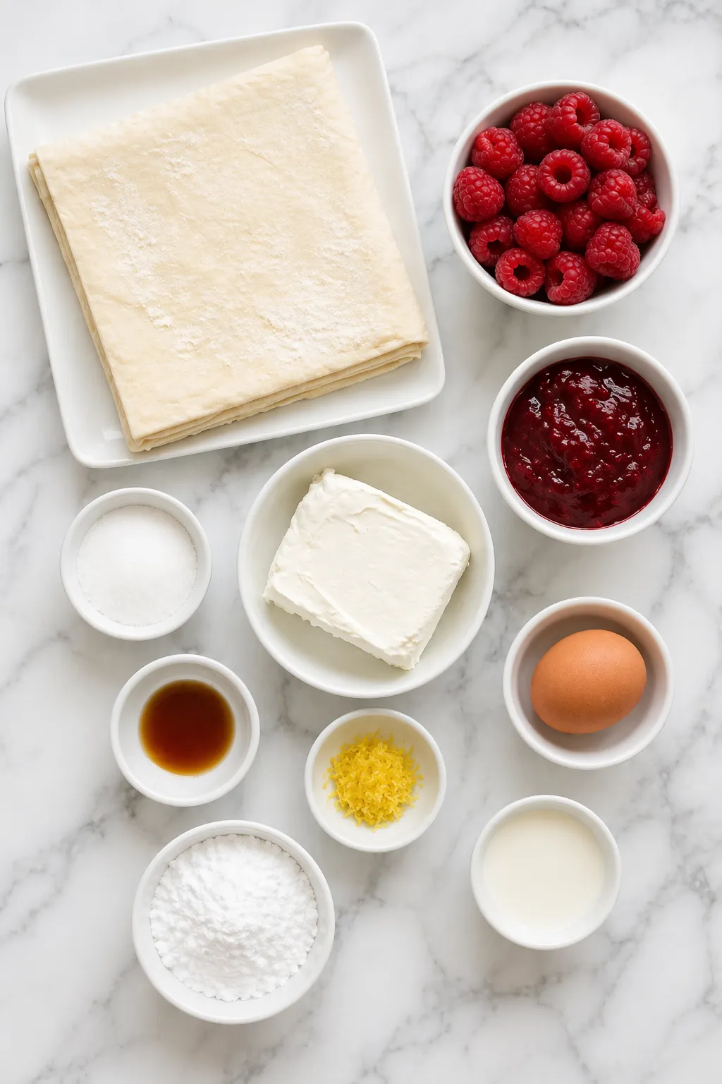 Each ingredient has a simple job in this recipe, from creating flaky layers to adding creamy sweetness and a jewel-like raspberry topping.